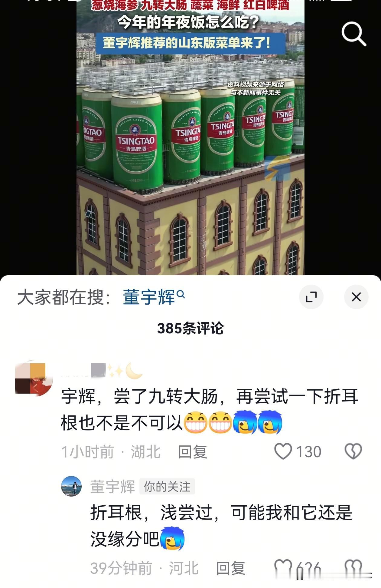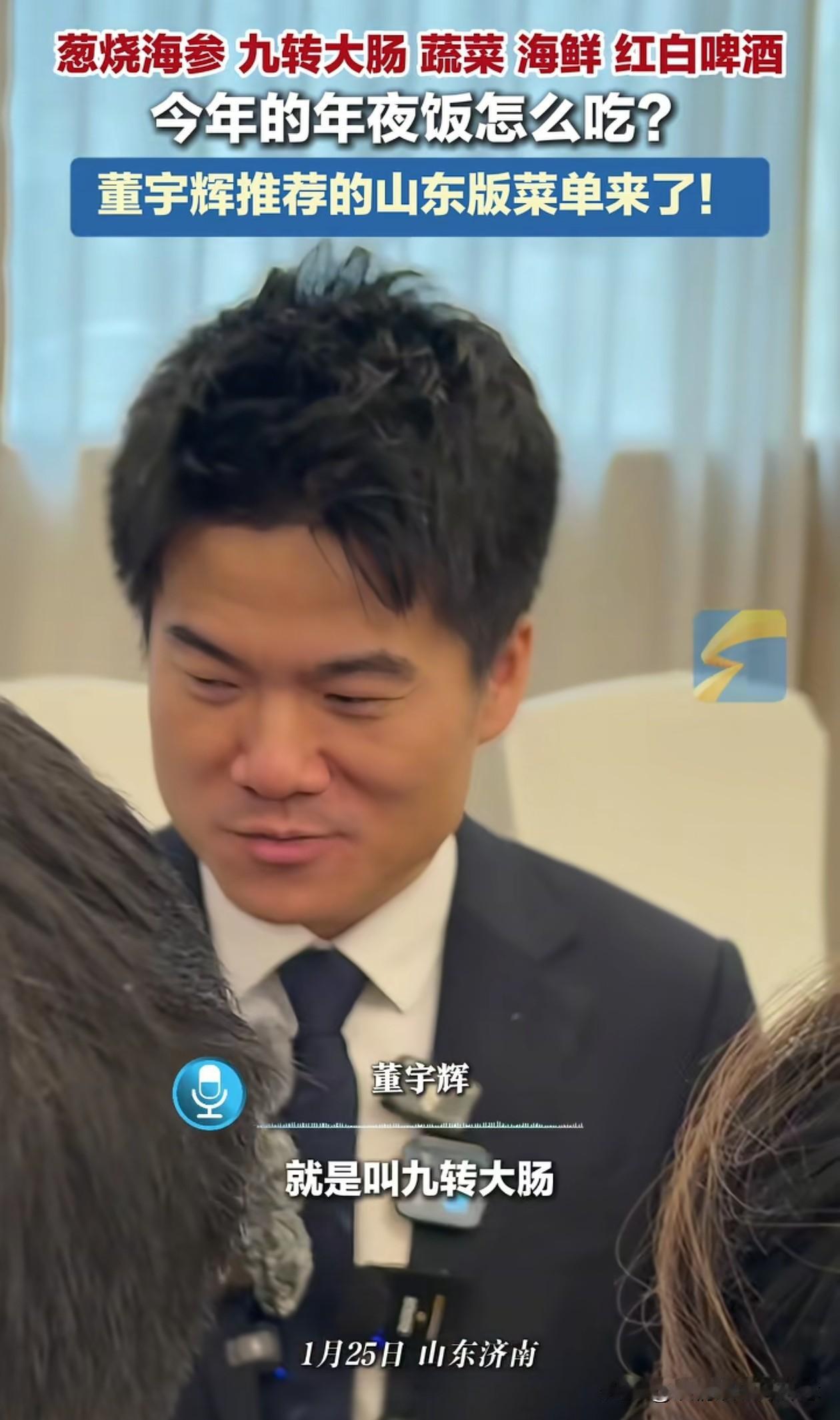 原来他在这里! 董宇辉25日在山东济南参加迎新消费季启动式,他说这里是“梦幻之地”,就感觉“城市在冒泡,大地在呼吸!” 记者提问:今年年夜饭怎么吃?宇辉推荐了山东的海鲜,啤酒,特别谈到九转大肠,以前不爱吃,昨天吃过了,感觉还挺好吃,糖醋味! 有网友在评论区建议宇辉尝一尝折耳根,宇辉回复:“折耳根,浅尝过,可能我和它还是没缘分吧!” 真希望宇辉什么时候能来贵州,再试试贵州的折耳根炒腊肉,凉拌折耳根,把贵州的折耳根介绍给全国的网友![笑哭] 大家有没有吃过折耳根?敢不敢试一试这特殊的味道?