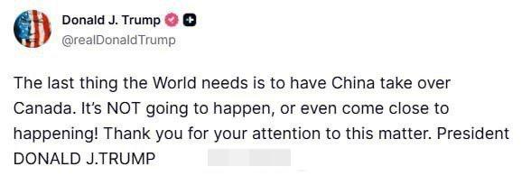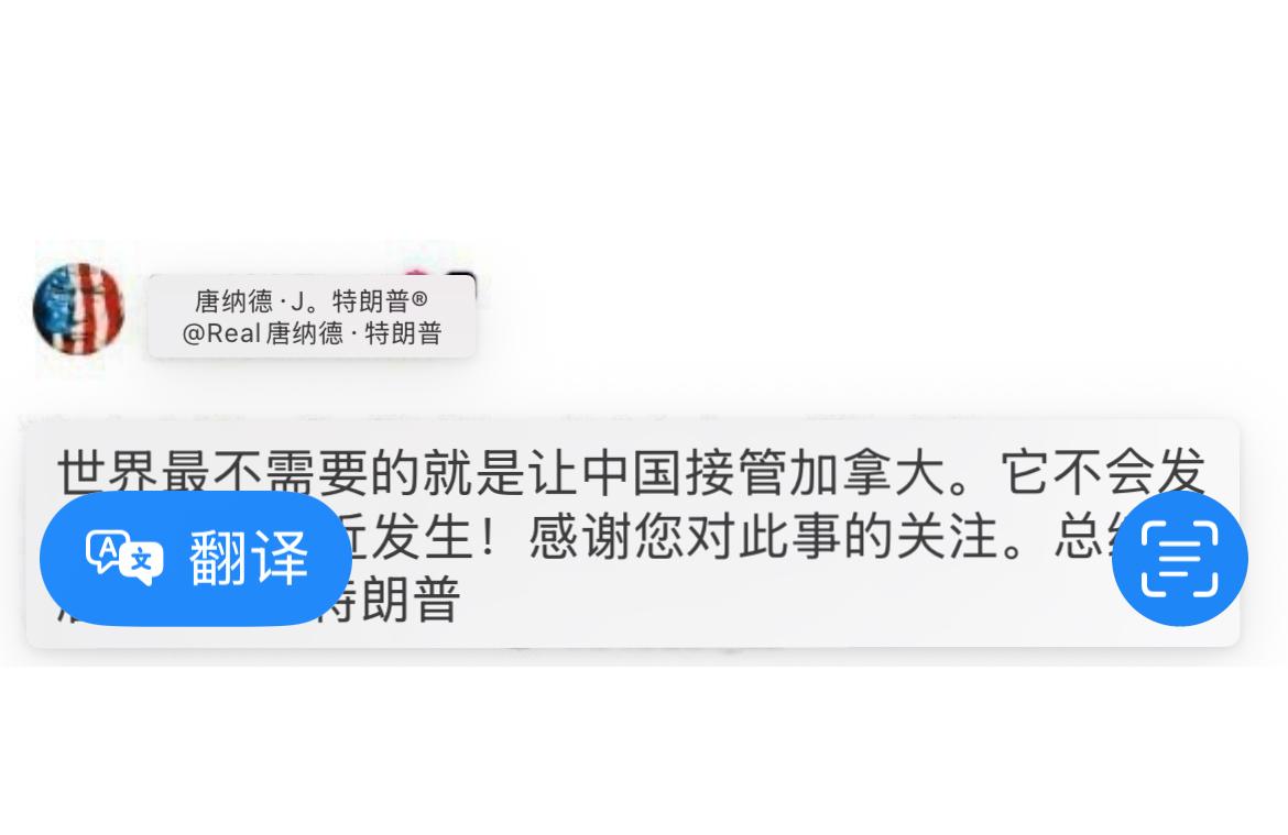 中国如今都不屑于理会美国了! 特朗普心口不一,近期一直在背后搞小动作。今天又大放厥词:“这个世界最不需要的,就是让中国吞并加拿大。这事绝不会发生,连一丁点可能性都没有!感谢各位关注此事。 唐纳德·J·特朗普 总统” 特朗普这话简直让人笑破肚皮!说什么“中国吞并加拿大”,这简直是精神错乱、信口雌黄! 实际上,加拿大总理访问中国是正常的国家间交往,是友好合作之举。但美国就是见不得其他国家友好合作,尤其是加拿大总理访华推动中加务实合作,这让美国更加坐不住了。美国一直把加拿大当作“后院”,当美国的州对待,根本容不得加拿大与中国走近,可见美国是多么蛮横无理、厚颜无耻! 中国向来奉行和平外交政策,怎会无端做出吞并他国之事。如今中国发展得越来越好,美国便心生嫉妒、百般使坏,特朗普这番胡言乱语便是他丑恶嘴脸的极致体现。不过中国也犯不着把他的话放在心上,专心走好自己的路,与其他国家加强友好合作,回击美国的恶意中伤。 事实上,美国那些小动作、小心思也绝对得不到世界各国的认可,终究也掀不起什么风浪。 接下来,英国、德国等国家也将相继访问中国,美国也计划四月访华,且看美国如何自圆其说吧!