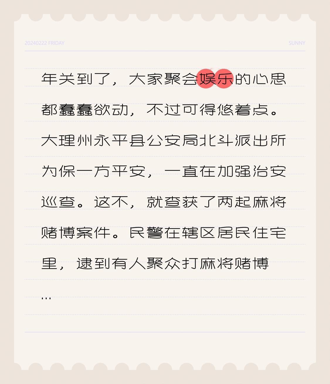 年关将至,人们聚会娱乐的兴致愈发高涨,不过可得把握好分寸。大理州永平县公安局北斗派出所为维护一方安宁,始终强化治安巡查工作。这不,近期就查获了两起麻将赌博案件。 民警在辖区居民住宅内,当场抓获聚众以麻将进行赌博的人员,现场赌资和涉赌人员无一逃脱。利用麻将牌进行现金赌博属于违法行为,这些人真是偷鸡不成反蚀把米。 年关本应是阖家欢乐的时光,大家适度娱乐放松心情即可,切勿为追求一时刺激而参与赌博。否则一旦被抓,这年也过不安生,纯粹是给自己添堵。 麻将