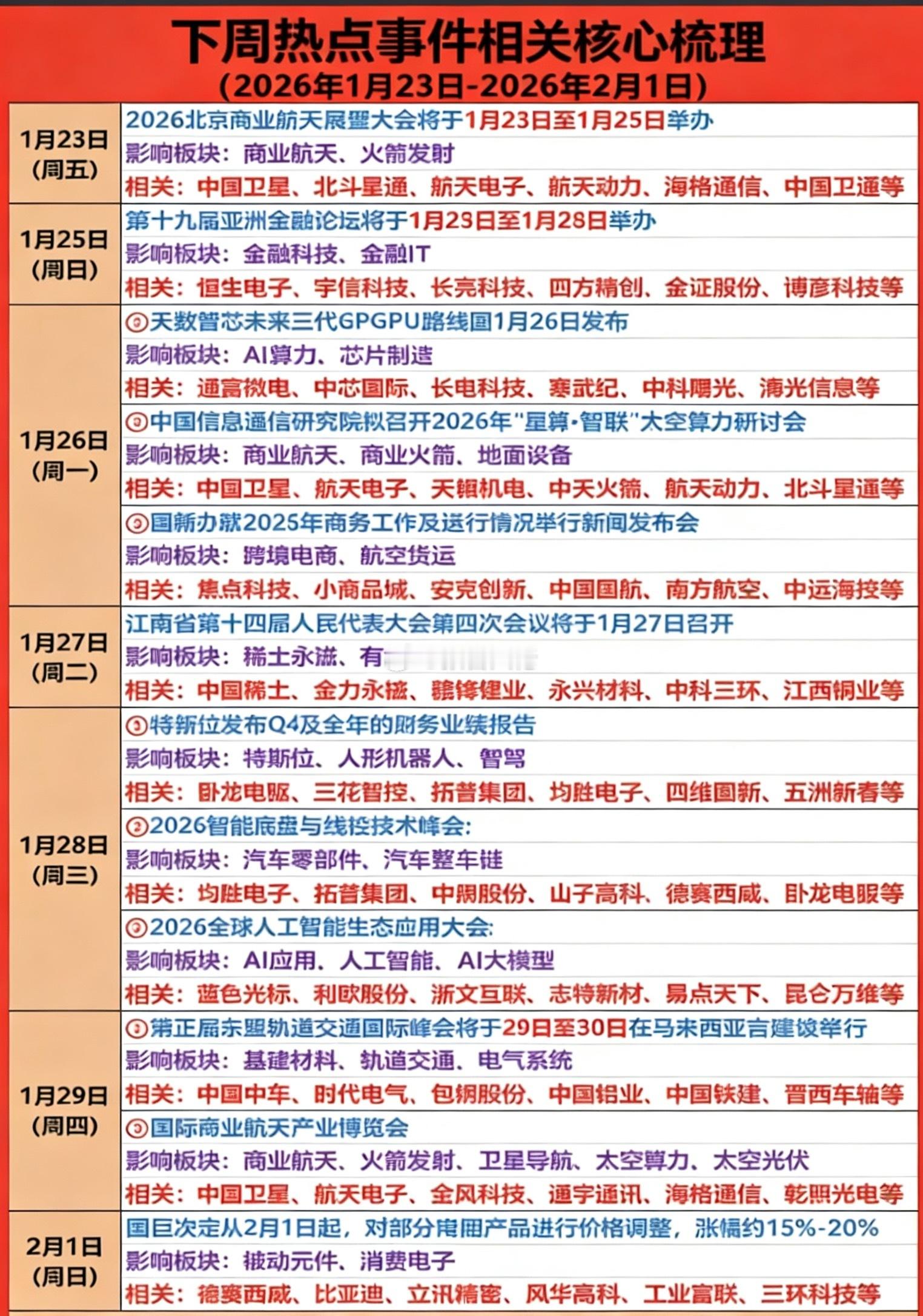 (1.26~2.01) 下周重要财经事件前瞻稀土永磁,无人驾驶,商业航天,AI应用,算力等
