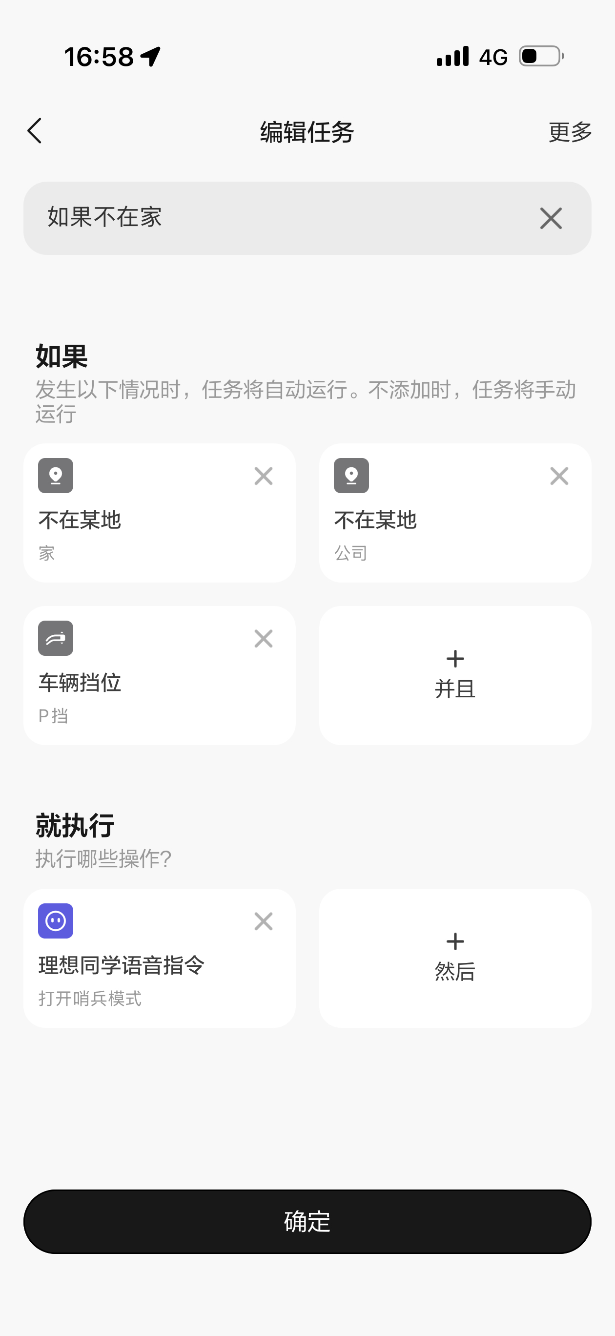 现在用电不心疼,已经习惯只要是陌生车位停车都打开哨兵模式,就干脆设置了自动任务。 但这个条件看起来是 and,按理说是 or 就生效,晚点到家就知道了。
