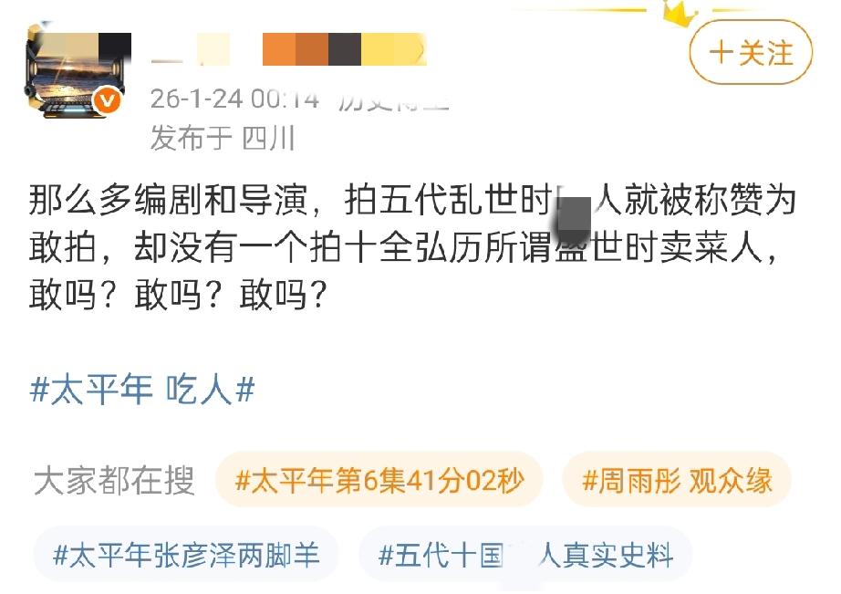 因为一部名为《太平年》的电视剧,大家开始讨论五代十国时期菜人的问题。然后我就看到某群体挑刺,为什么不拍清代菜人的问题? 对此我想说,哪个封建王朝时期没有菜人的问题,就拿你们心心念念的明朝来说,也有菜人的问题。朱元璋时代就有,淮右军嗜食人的记载。 到了明宪宗成化年间,湖广指挥使彭伦,将俘虏乱箭射杀,然后让明军士兵分食。宗室朱有熺也吃菜人,他喜欢吃肝脏和大脑。