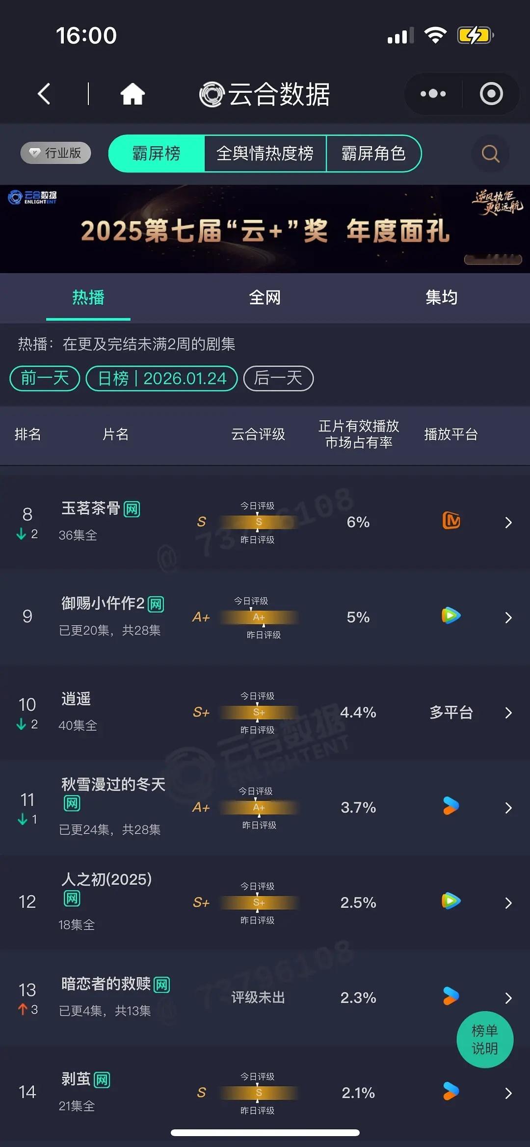 大盘1.7+吧太平年 次日10.9% 翻3.3倍,1800+,凑合吧,毕竟三平台数据不会太难看突然的喜欢 7.2% 1200+暗恋者的救赎 谁的剧,完全没看到宣传