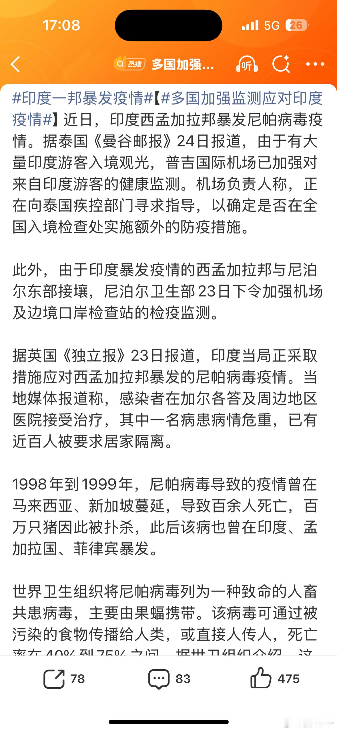 世卫称尼帕病毒或引发全球大流行又是春节……印度老哥先别过来了呗,我害怕