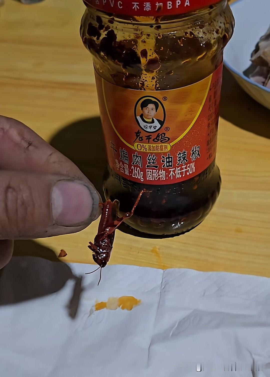 老干妈再次陷入舆论危机!最近有网友在老干妈干煸肉丝油辣椒酱里吃到了蝗虫,很多网友认为是蛐蛐,从图片来看确实是蝗虫,有些地方叫蚂蚱,就是这个东西!它为什么会出现在老干妈里辣椒酱里,是当配料放入的吗? 目前老干妈还没有作出回应,不过有些网友认为事情不大,蚂蚱能吃,价格也贵,一般人还买不到这种隐藏款的老干妈。但问题就在于,老干妈从未有过这个料,蚂蚱怎么跳进去的,需要调查取证。如果是恶作剧,老干妈可以起诉视频发布者。 但从图片来看,蚂蚱更像是混入其中的,也就是在封装过程蚂蚱就已经存在了。这就暴露了老干妈在生产环节卫生管控、包装密封性、异物检测技术、供应链管理、危机公关处理等方面存在漏洞,消费者以后如何选择,就看老干妈如何回应此事了。