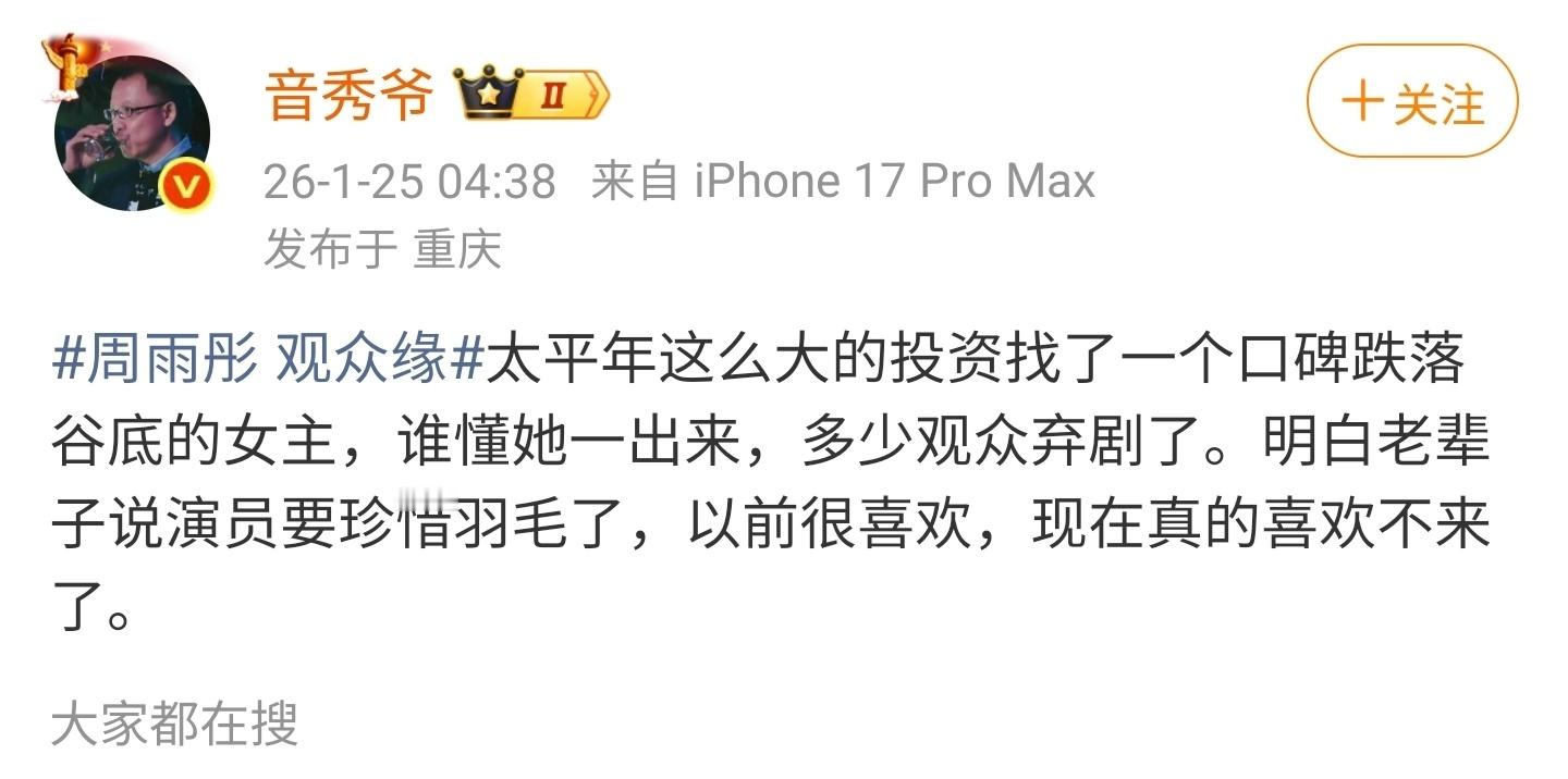 《太平年》播出效果拉胯,居然有网友怪周雨彤人缘差?这锅甩得也太莫名其妙了吧!她一个女主在这部大男主群像剧里戏份本就不算核心,剧播得不好,怎么能把屎盆子扣在她头上?这部剧糊得明明白白,根本是自身硬伤一堆:五代十国的历史门槛高,人物扎堆出场看得人一脸懵,还搞跳播剪得剧情支离破碎,开篇就整些压抑的虚构情节劝退观众。服化道再精良也救不了稀烂的叙事节奏。这些问题哪一个跟周雨彤有关系?再说了,剧里白宇、朱亚文这些大男主才是全剧灵魂,戏份占比、剧情重心全围着他们转。就算演技没硬伤,也没撑起这混乱的故事,没让普通观众看进去,这难道不是责任?怎么没人说他们?别总逮着女演员挑刺行不。