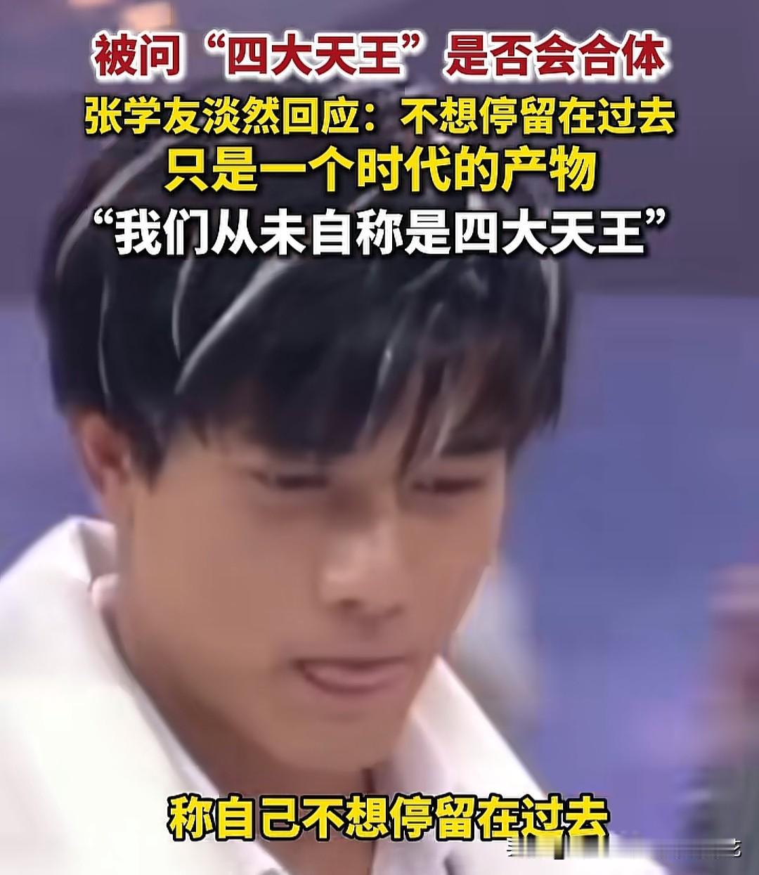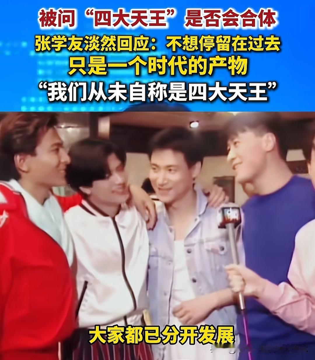 香港“四大天王”确实是一个时代的产物,不可能合体,也不可能再像以前重回月坛巅峰,即便四人重组也很难吸引到新人,追捧四大天王的忠诚粉丝依然还是那一批人,就跟王心凌的粉丝一样,不是大批的年轻人喜欢王心凌,而是喜欢王心凌的粉丝都还在。 张学友也表态,自己以及其它的三个成员都从未自称过“四大天王”,这足以道出了四位的人品。毕竟四大天王本来就是媒体将四位优秀艺人的一个统称,他们并没有因为这个称呼,有任何优待或骄傲。 值得一提的是,四大天王的诞生,更多是香港乐坛在谭咏麟、张国荣等巨星淡出颁奖礼后,面对台湾乐坛齐秦、王杰、周华健等歌手的强势冲击,为了重塑本土乐坛标杆而推出的策略。也可以这么说,如果没有四大天王,香港再无乐坛,就真的只剩下娱乐圈了。