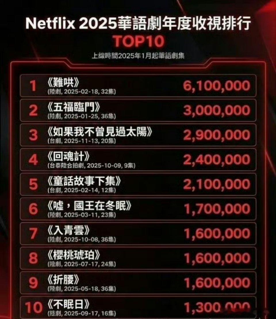 网飞2025年度华语剧集收视排行,白敬亭《难哄》断层第一 !!!白敬亭《不眠日》排名第十!!!