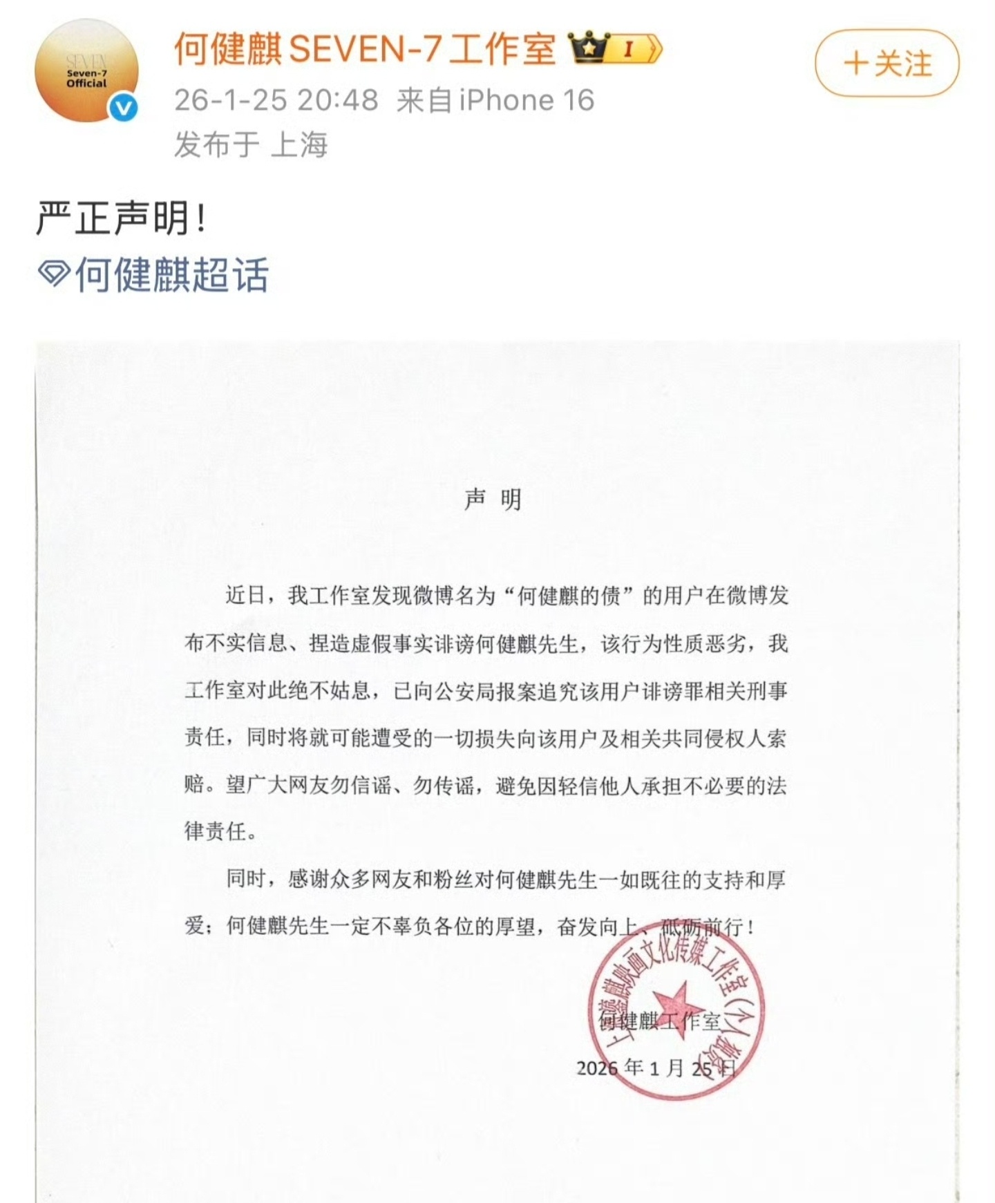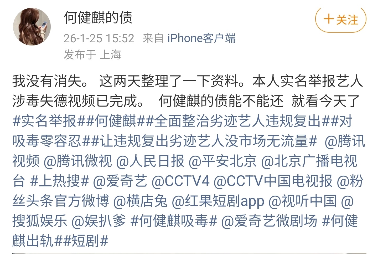 何健麒被举报涉毒刷到何健麒被举报涉毒的瓜。一个叫“何健麒的债”的新号,空口白牙说自己是前女友,实名举报涉毒,结果连个聊天记录、照片、时间线证据都没晒,纯靠嘴说?这账号一看就是临时注册的,没头像没历史动态,就发了一条举报微博,说什么“横店酒店聚众吸毒”,连个具体房间号、同行人都讲不清,纯属空口造谣啊!涉毒是多大的事,没有实锤就敢实名指控,这是想鱼死网破还是博眼球?何健麒工作室连夜发声明辟谣,说已经报警追究诽谤罪。新号+无实锤+空口指控,明眼人都能看出来不对劲吧!真要是有证据,怎么不敢晒出来?现在就等着警方调查结果,相信法律会还何健麒一个清白,别让无辜的人被恶意抹黑!