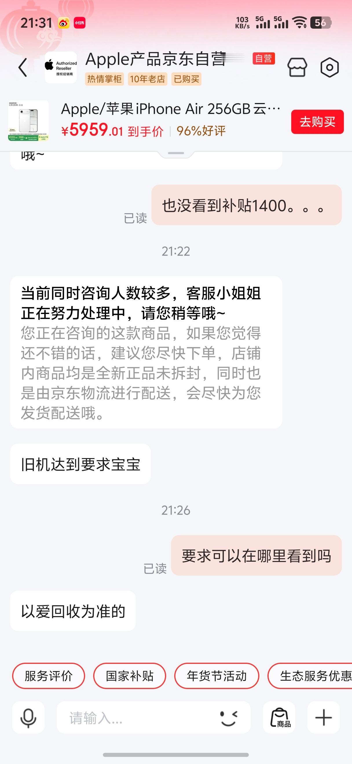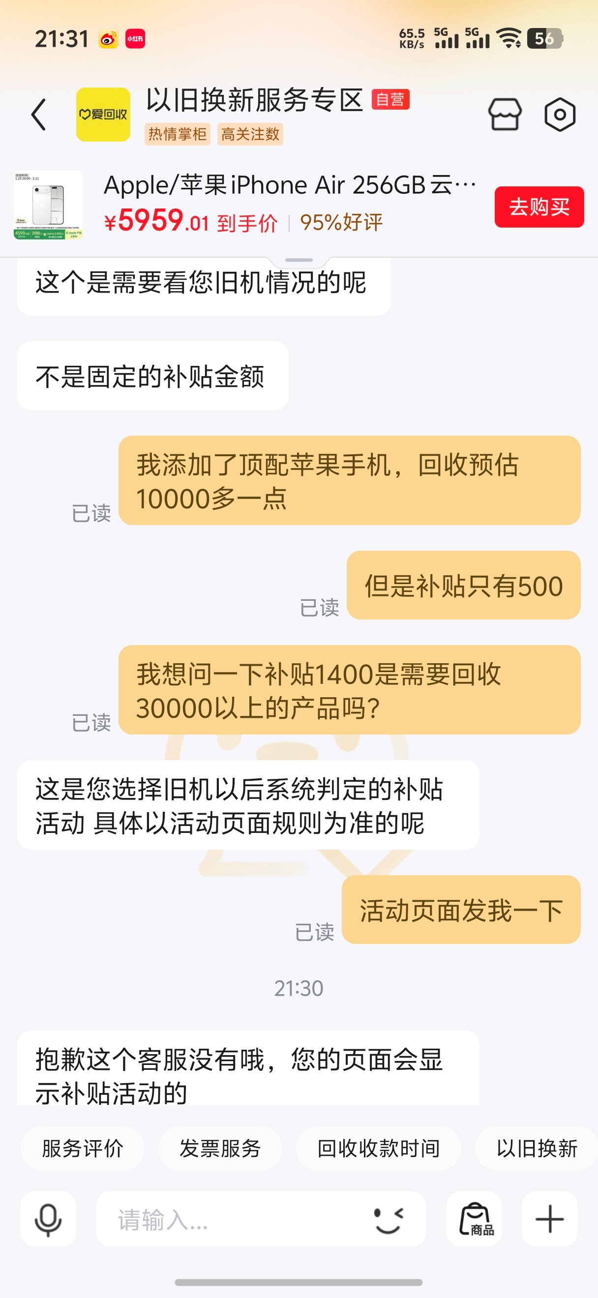 京东这个「最高补贴1400」挺鸡贼的,条件是啥也没说,我试了一下顶配 iPhone 17 Pro Max 回收价格 10000+,也只补贴 500 问了一下京东的,皮球踢给爱回收。爱回收客服也根本说不清楚