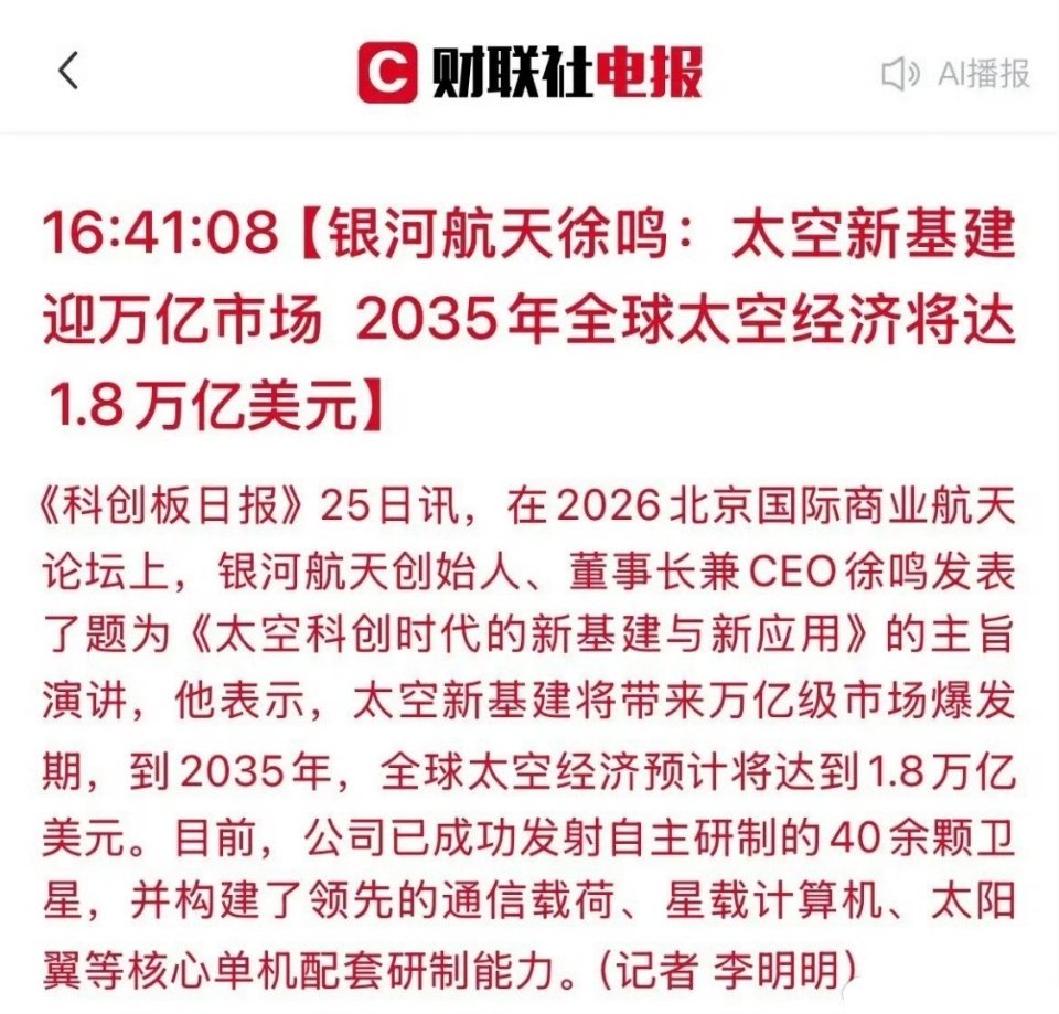 “太空经济”引爆万亿赛道!这些A股公司迎黄金机遇期!银河航天创始人最新发声:太空新基建正迎来爆发式增长,预计到2035年,全球太空经济规模将突破1.8万亿美元(约合13万亿人民币)!我国商业航天产业已迈入快速发展新阶段。目前,银河航天已成功发射40余颗卫星,标志着我国低轨卫星星座建设进入规模化推进阶段。随着星网集团、国家卫星互联网工程等重大项目加速落地,2026年有望成为我国卫星密集发射的关键之年。核心受益方向梳理:1. 卫星制造与火箭发射· 中国卫星:我国卫星制造龙头企业,业务覆盖卫星研制、应用及服务全链条。· 上海瀚讯:专注宽带移动通信技术,在卫星通信载荷等核心分系统领域具备技术储备。· 航天智装:业务涵盖航天微电子、智能装备等卫星制造相关环节。· 航天工程/航天动力:航天科技集团旗下企业,涉及火箭发动机及航天工程技术。· 九丰能源:积极布局商业航天燃料供应链领域。· 国光电气:真空技术产品可应用于航天发射支持系统。2. 核心配套与关键部件· 盛路通信:在毫米波技术、有源相控阵天线领域技术领先,是卫星通信载荷核心供应商。· 信维通信:专注天线及射频技术,积极布局卫星通信业务。· 盟升电子:卫星导航和通信产品技术领先,专注卫星动中通天线研发。· 复旦微电/紫光国微:在航天级FPGA、安全芯片等核心元器件领域占据重要地位。· 航宇微:业务涵盖宇航电子、卫星大数据等卫星制造配套服务。· 航天机电:专业从事航天太阳能电池及电源系统研制。· 中航光电:国内高端连接器龙头企业,产品广泛应用于航空航天领域。· 航天电器:专注高端连接器、继电器等卫星配套产品。· 光威复材/中简科技:高性能碳纤维复合材料供应商,用于卫星轻量化结构。· 宝钛股份:高端钛材供应商,产品应用于航天器结构件。· 菲利华:石英纤维材料领军企业,产品用于卫星隔热部件。3. 地面设备与运营服务· 海格通信:无线通信和北斗导航龙头企业,重点发展卫星通信地面终端业务。· 华测导航:高精度卫星导航定位专家,技术与终端适配卫星互联网应用。· 中兴通讯:通信设备巨头,布局卫星通信标准、终端芯片及天地融合网络。· 中国卫通:我国主要卫星通信运营服务商,卫星互联网应用核心平台。