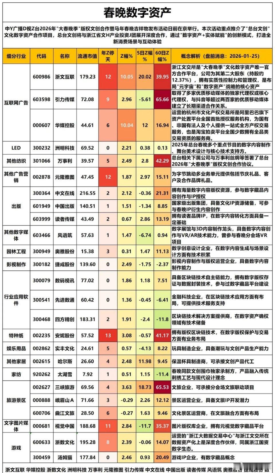 春晚+数字资产双风口引爆!总台文创重磅合作落地,这些概念股站上潮头央视重磅推介**“总台文创”文化数字资产合作项目**,标志着总台文创与浙江省文化产业投资集团的战略合作正式迈入实质阶段。双方创新性打造**“数字资产+实体赋能”新模式**,深度融合文化IP与数字化技术,打破线上线下消费边界,探索数字化时代文化消费的全新场景与体验,有望撬动文化数字经济新蓝海。核心概念股全梳理:浙文互联、华媒控股、浙数文化、洲明科技、万事利、元隆雅图、引力传媒、中文在线、中国出版、读者传媒、风语筑、奥雅股份、捷成股份、数码视讯、先进数通、四方精创、安妮股份、实丰文化、哈尔斯、太湖雪、三峡旅游、峨眉山A、曲江文旅、视觉中国、汤姆猫