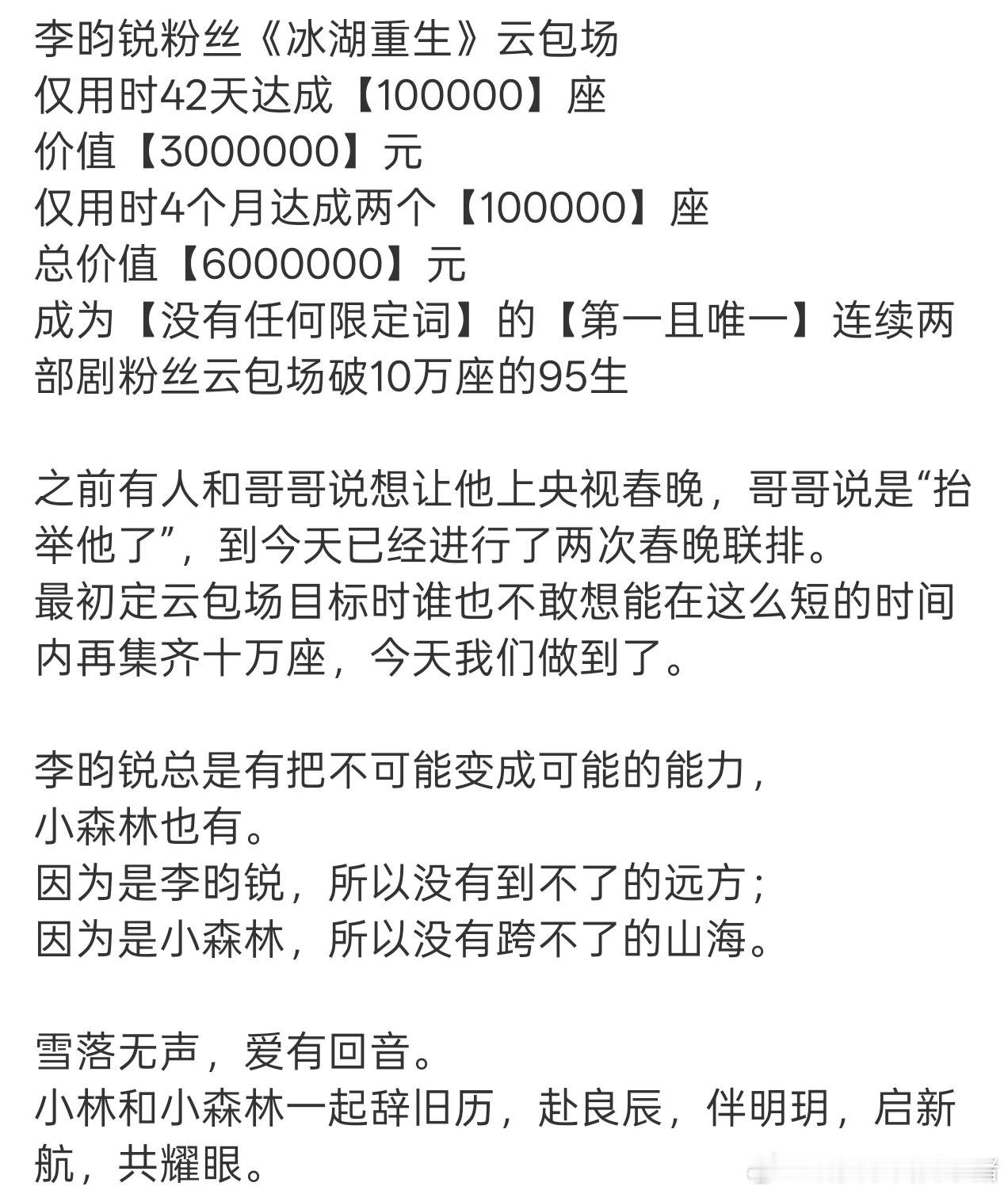 李昀锐粉丝冰湖重生云包场,第一且唯一95生连续两部剧云包场破10w🐮