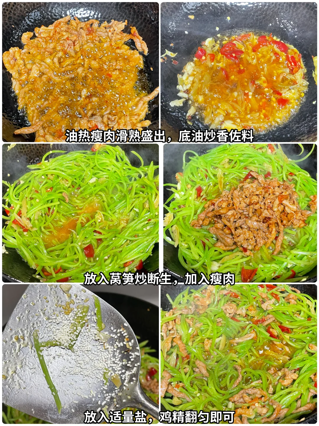 4⃣️起锅烧油,油热将瘦肉滑熟盛出,锅里,底油炒香泡椒、蒜和花椒,然后放入莴笋炒断生,加入瘦肉。翻匀调味,加入适量的盐和鸡精翻匀即可出锅。这样做出来,莴笋炒肉丝保留了莴笋的清香味,又有瘦肉的肉香。喜欢的姐妹试试吧。