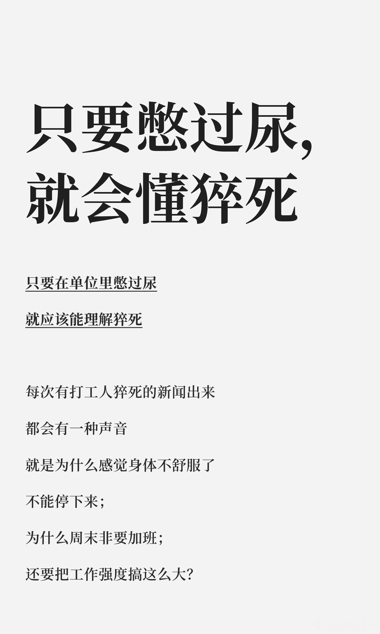 只要憋过尿,就会懂猝死每次有打工人猝死的新闻出来,都会有一种声音,就是为什么感觉身体不舒服了不能停下来?其实就跟上班的时候憋尿,是一个原理。