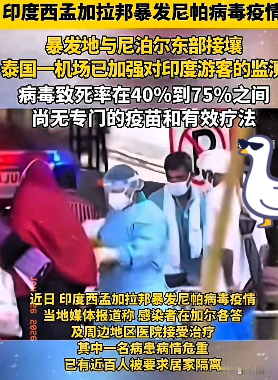 警报拉响了,就在周边的国家还在观望的时候,泰国和尼泊尔已经率先动手直接对印度游客拉起了防御防空警戒线,这并不是歧视而是对国民的负责,面对致死率太高的尼帕病毒谁也不敢怠慢。 这两个国家的果断,说到底是看清了尼帕病毒的可怕本质,也摸透了当下疫情传播的潜在风险。 印度西孟加拉邦的疫情已出现确诊病例,近百人被居家隔离,而该邦和尼泊尔东部接壤,泰国又常年有大量印度游客入境, 地理和人员流动的特点让两国成了首当其冲的风险区,坐视不理就是拿本国公共卫生安全开玩笑。 尼帕病毒是世卫组织认定的致命人畜共患病,主要靠果蝠传播,还能通过被污染的食物、直接接触实现人传人,潜伏期短则4天,长的能到45天,致死率卡在40%到75%之间,目前既无疫苗也无特效药,一旦输入境内,扩散的后果根本扛不住。 也正因如此,泰国和尼泊尔的防疫措施才掐准了关键,机场和边境口岸加严体温检测、核查出行史,发现症状立刻送医,还要求医院及时上报疑似病例,这都是针对病毒传播特点的精准防控。 对普通人来说,预防的核心就是远离野生果蝠等易感动物,不吃可能被污染的食物,和疫区来的人员接触后及时做好消毒,一旦出现发烧、头痛、呕吐等症状,必须第一时间就医。 周边国家的观望其实不难理解,防疫和人员流动、经济发展要找平衡,但泰尼的行动已经给所有人提了醒,面对这种致命病毒, 早设防才是最稳妥的办法,任何侥幸心理都可能酿成大祸。尼泊尔国 印尼指数 巴厘岛猴子预警 印度猴痘疫情