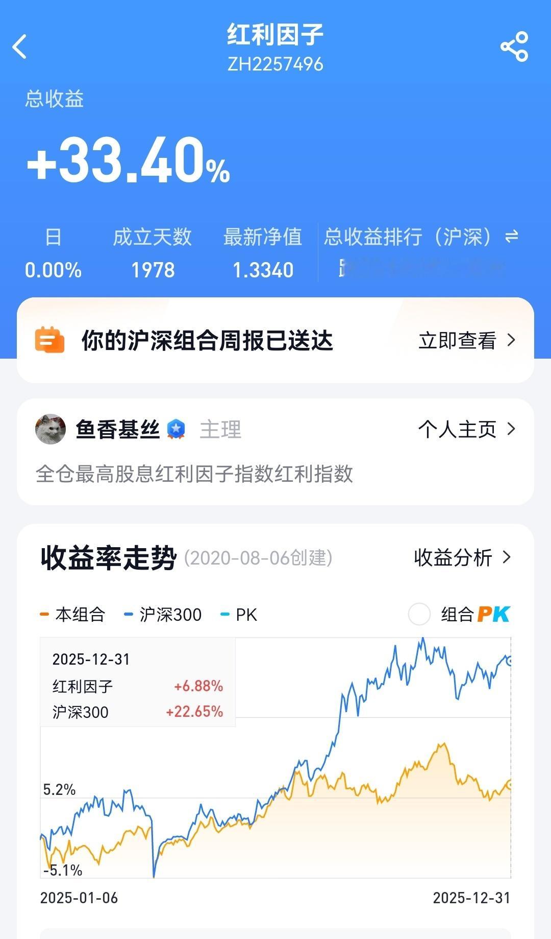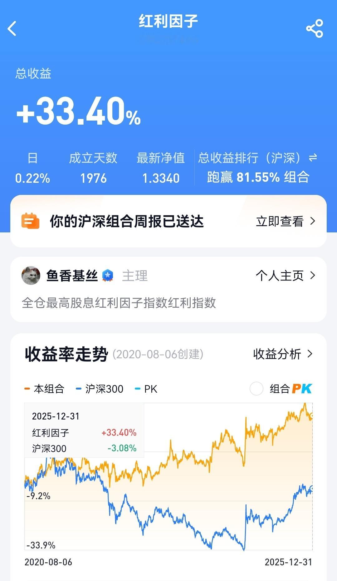 指数基金组合试验 红利因子组合该组合全仓中证红利指数基金ETF,一直满仓,中间没有买卖。红利因子组合2025年全年收益率6.88%,跑输沪深300指数16个百分点,组合2020年8月成立以来,收益率33%,而同期沪深300指数收益率只有可怜的-3%,中证红利大幅跑赢沪深300指数36个百分点。我们可以看到,2025年,随着大盘上涨,红利指数干不过沪深300,跑输大盘,但如果把时间拉长到5年以上,中证红利指数还是明显能跑赢大盘的,特别是在下跌波动的生活,稳稳保住收益,不断上升,适合长期关注。历史已经证明了红利因子在投资中的有效性和稳定性,所以普通投资者可以将中证红利指数做为重要投资标的加以关注,因为红利因子投资以高股息为重点,不断的红利再投资,更符合买股票就是买公司的投资本质,实现投资滚雪球。这个是我的试验组合,并不是实盘,随着最近下跌,中证红利指数估值已经不断回归已经跌到60%多了,股息率4%以上,可以开始关注了投资a股基金