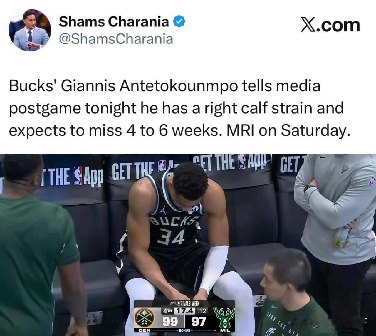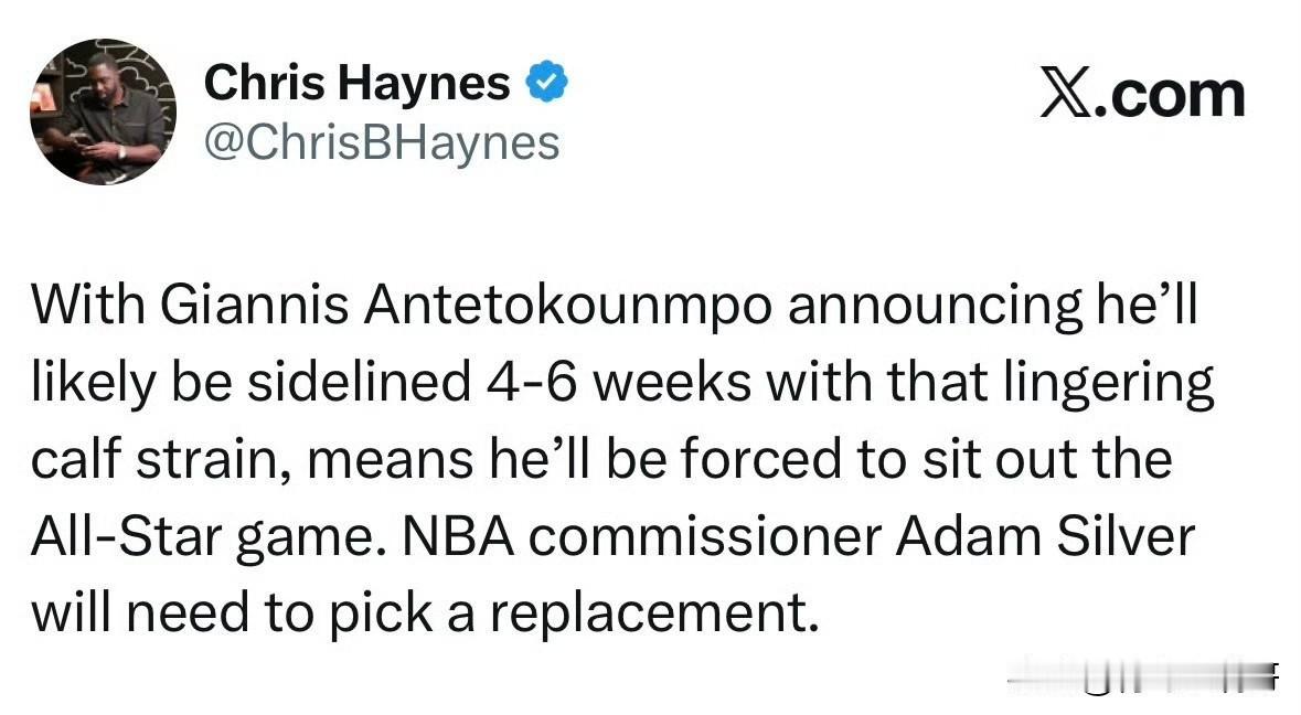 无缘全明星大赛!!!字母哥右侧小腿拉伤,缺阵4-6周! 根据记者Shams消息透露,雄鹿超级球星字母哥遭遇了右侧小腿拉伤,预计他将缺席4-6周,根据海爷Haynes补充消息,这也意味着字母哥无缘本届全明星大赛,NBA总裁肖华将选择一名球员来替代字母哥。 字母哥作为东部的票王,也是当今联盟炙手可热的超级球星,很多球队都希望得到他来冲击总冠军,而且目前他的年龄也还处于巅峰期,需要好好利用他最后几年的职业生涯,毕竟希腊怪兽可是很猛的。 字母哥目前的情况并不明朗,谁也不确定他在密尔沃基的时间还有多久,字母哥也想拥有一人一城的职业生涯,但是雄鹿目前真的是没有任何竞争力。 希望字母哥早日康复,加油!字母哥 雄鹿队 雄鹿 字母哥 Nba全明星