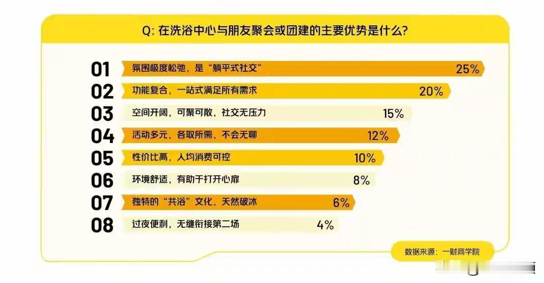 2026年,洗浴中心异军突起成为年轻人的“第三空间”,美团数据显示其交易订单同比增长超30%,18-35岁用户占近六成。 这并非传统澡堂复兴,而是业态的彻底革新。如今的中高端洗浴中心,已转型为集泡澡、无限量餐饮、电竞、观影、住宿于一体的“城市休闲综合体”。人均百元出头的价格,可购买12小时以上的全方位休闲,性价比极高。 其商业逻辑也从单一卖门票,变为以低价门票吸引客流,再通过SPA、餐饮等增值服务盈利的“流量经济”模式。这精准契合了年轻人追求高性价比、降低决策成本、保有社交边界感的核心需求。 从民生角度看,这反映了年轻人一种理性的“压力代偿”消费哲学:用可承受的成本,置换高浓度的自由时间和情绪疗愈。洗浴中心的火热,是一场由年轻人定义的城市生活方式革命。洗浴会所 浴池洗浴中心 洗浴休闲场所 大空间洗浴 性价比洗浴中心 洗浴设计排行 洗浴排行