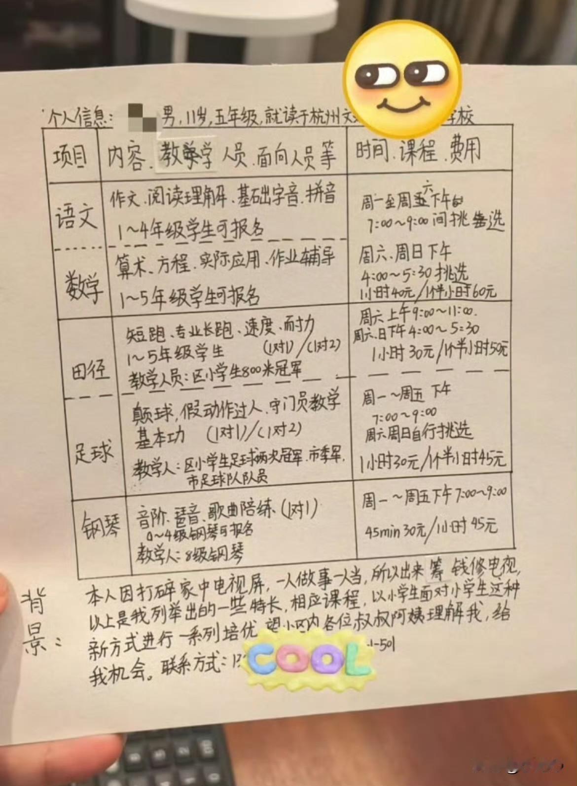 杭州有个11岁的小男孩叫尧哥,妥妥的现实版小小男子汉,不小心划破家里电视屏要赔6000块换屏费,人家没哭没闹也没找爸妈兜底,直接拍板要自己创业还债,这魄力真的绝了。别看尧哥年纪小,办事儿那叫一个有章法,还债计划一敲定,立马就琢磨起赚钱路子,还亲手做了一张明明白白的创业海报。上面的收费标准看得人直呼实在,陪写作业一小时40块,田径陪练一小时30块,足球陪练也是一小时30块,就连钢琴陪练都按45分钟30块来算,跟外面的辅导价格比起来,这纯纯就是白菜价,性价比直接拉满,竞争力直接拉到顶。海报做好后,尧哥就找妈妈帮忙,把自己的这份“创业广告”发到了小区业主群里。谁能想到,消息刚发出去,立马就收获了小区叔叔阿姨们的热烈支持,大家都被这个有担当的小孩哥打动了,纷纷给尧哥捧场,家里有娃的都想着让尧哥帮忙带一带、教一教。从那之后,尧哥的创业小事业就正式步入正轨,每天放学放下书包,来不及歇口气,就开始帮小区里的弟弟妹妹们陪写作业,耐心又负责,把小伙伴的学习安排得明明白白。到了周末更是忙得脚不沾地,日程表排得满满当当,田径陪练、足球陪练、钢琴陪练连轴转,小小的身影忙前忙后,却从来没喊过累、没抱怨过一句。大家不光是冲着实惠的价格找尧哥,更看重这孩子身上敢作敢当的劲儿,自己闯的祸自己扛,不推诿不逃避,还能用实打实的行动去弥补,这份责任心在同龄人里真的少见。而且尧哥做事特别靠谱,不管是陪写作业还是做各类陪练,都拿出十二分的认真,把每一项任务都完成得妥妥帖帖,口碑也越来越棒,找他的人自然越来越多。就这样踏踏实实忙活,还不到两个月的时间,尧哥就靠着自己的努力攒够了6000块钱。他捧着这沉甸甸的6000块现金,郑重其事地交到了妈妈手上,用自己赚来的钱给家里换上了崭新的电视显示屏,成功还清了这笔“债务”。小小年纪就敢作敢当,犯错了不逃避不推诿,还能想办法靠双手弥补,既展现了超强的执行力,又有满满的责任感。比起很多遇事只会依赖父母的孩子,尧哥用自己的实际行动,活成了同龄人里的榜样,难怪大家都忍不住夸他是靠谱又能干的小孩哥,这样的担当和魄力,真的太让人佩服了。