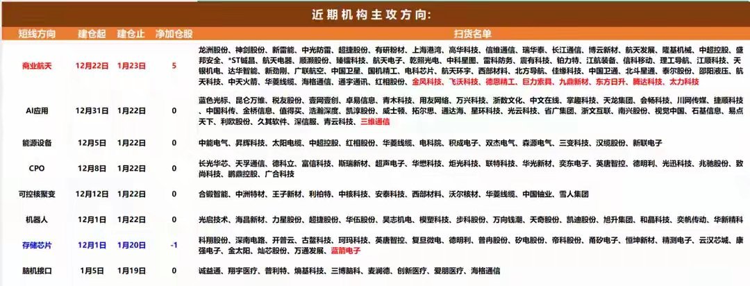1月26日A股猛料:四大利好共振!全球资本市场迎超级风暴周聚焦A股每日重磅消息!核心提醒:主力资金极少在利好出炉后直接拉涨涨停,股民朋友不妨让利好落地发酵,耐心等待更优质的投资机会!国内外财经要闻&A股大盘展望猛料一:1月PMI数据将公布,定调A股中期走势事件:1月31日国家统计局将发布1月PMI数据,去年12月制造业PMI录得50.1%,环比回升0.9个百分点,结束连续8个月枯荣线下方运行态势,首次重回扩张区间。点评:林哥此前多次强调PMI数据的核心价值,其一,制造业与非制造业PMI是国内经济运行的直观晴雨表,基本面直接决定股市中期走向;其二,PMI作为每月首个披露的官方经济数据,前瞻性远超其他指标,数据异动会直接引发股市即时反应。当前市场普遍预期1月PMI将站稳50%荣枯线,为A股提供中期基本面支撑。猛料二:美联储1月利率决议将公布,95%概率按兵不动事件:下周美联储将公布1月利率决议,芝商所“美联储观察”显示,市场预判本次维持利率不变的概率达95%。点评:本周美股迎来“超级风暴周”,美联储议息会议、科技巨头密集财报、美国地缘政治不确定性等因素交织,美股大概率迎来剧烈波动。在此背景下,国际热钱避险需求升温,贵金属与中国资产将成为首要避险选择。大盘预判:上周A股依托5日线碎步上行,波动收窄,核心源于主动基金坚定做多与国家队压盘的博弈。短期来看,若国家队延续控盘思路,即便主动基金加仓,市场也难快速加速,本周大概率继续沿5日线缓步走强。但随着指数逼近4200点压力位,不排除出现中阴回调下探20日线的可能,而此类回调反而有望缓解国家队控盘压力,释放市场做多动能。行业/板块/题材概念消息点评猛料三:AI热潮引爆金属需求,碳酸锂期价创阶段新高事件:上周碳酸锂期货价格突破18万元/吨,创阶段新高,1月23日主力合约收报181520元/吨。点评:利好锂电池板块。2025年初以来MSCI金属与矿业指数累计大涨近90%,机器人、新能源车、AI数据中心的需求爆发持续推高金属价格,碳酸锂价格走高是国内供应收缩预期与下游需求向好的共振结果,储能订单火爆叠加“抢出口”效应,将支撑碳酸锂市场1-2月“淡季不淡”。A股锂电池板块中期累计涨幅较大,短期虽维持强势,但爆发力有所减弱。资金面:近1个月锂电池板块5家公司获主力大幅买入,机构参与度较10-11月明显下降。技术面:板块11月完成中期主升浪后震荡整理,近期再度走强;上周五中阳拉高后小幅偏离5日线,存在超买迹象,周一高位分歧概率较大。猛料四:芯片重磅利好!三星Q1 NAND闪存价格暴涨超100%事件:三星电子2026年第一季度将NAND闪存价格上调超100%,涨幅超市场预期,目前正与客户洽谈Q2价格,涨价趋势有望延续。点评:利好存储芯片板块。数据中心扩张推动企业级eSSD需求爆发,端侧AI带动移动设备、PC高容量存储升级,存储芯片需求指数级增长,而供给端跟进滞后,市场陷入“有价无货”状态,AI驱动的存储芯片超级周期全面到来。机构预测2026年DRAM、闪存均价将分别上涨88%、74%,远超此前53%、44%的预判,存储芯片成为A股中期核心主线。资金面:近1个月近20家存储芯片公司获机构大幅加仓,买入比例较高;但板块中期涨幅偏大后,上周机构追高意愿有所松动。技术面:2025年10月前完成一轮中期主升浪,蓄势2个月后,2026年1月开启新一轮主升浪,目前处于1浪结构,指数不破10日线,趋势不改。猛料五:四大利好共振!商业航天开启新一轮主升浪事件:商业航天近期利好密集落地:①马斯克表示SpaceX今年有望实现星舰完全可重复使用,太空进入成本骤降99%;②北京印发商业卫星遥感数据资源开发利用措施(2026-2030),强化空间基建;③酒泉发布商业航天产业发展规划,打造国家级发射基地;④蓝色起源计划发射5400余颗卫星,打造全新通信网络。点评:利好商业航天板块。北京、酒泉等核心区域的政策支持牵引行业发展,商业航天迈入供需双向发力的黄金时代,行业正从国家航天向商业航天转型,低轨卫星聚焦空间段与地面段基建,短期核心看卫星制造,上中游分系统及材料端因支撑卫星量产率先受益。商业航天是2025年12月以来A股核心主线,交投活跃度居高不下。资金面:近1个月近60家商业航天公司获机构大幅加仓,加仓规模断崖式领先,较第二名AI应用板块近乎翻倍。技术面:板块2025年12月开启中期主升浪,完成1浪结构后,上周实现2浪向3浪的转换,目前进入3浪主升阶段;需注意3浪是主力主要减仓期,上行高度或存限制。龙虎榜&游资&主力机构调仓分析游资大佬重点狙击深南东路:净买入金安国纪(PCB)6045万中山东路:净买入乾照光电(商业航天+军工)1.59亿章盟主:净买入德恩精工(商业航天)4095万、睿创微纳(商业航天+军工)4936万、晶科能源(光伏)7265万作手新一:净买入飞沃科技(商业航天+风电)1.09亿、浙文互联(AI应用)6170万炒股养家:净买入越剑智能(专用设备)1375万、武进不锈(钢铁)1689万、瑞华泰(商业航天+军工)1510万思明南路:净买入锋龙股份(通用设备)1.59亿玉兰路:净买入蓝箭电子(存储芯片)2663万方新侠:净买入东方日升(商业航天+光伏)6683万相城大道:净买入臻镭科技(商业航天)5.02亿游资整体调仓前一交易日游资净买入超1000万个股14只,净卖出超1000万个股9只;板块层面,大幅加仓商业航天、军工,中幅加仓光伏、专用设备,小幅加仓存储芯片、PCB、风电、钢铁;中幅减仓物流,小幅减仓AI应用、可控核聚变、工业金属、电