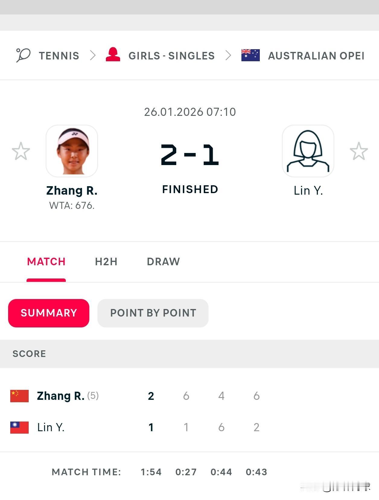 澳网青少年女单次轮 张瑞恩6-1/4-6/6-2台湾林郁晨。 祝贺🎉晋级16强。 稍后是孙心然的比赛。