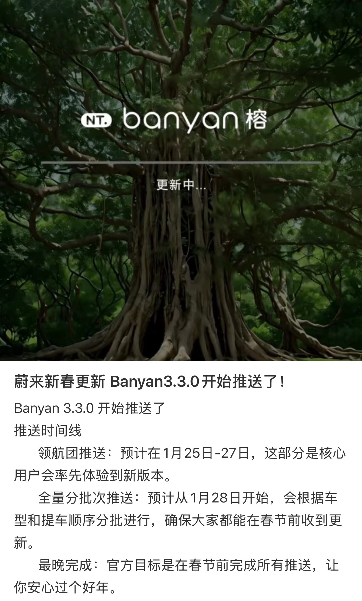 蔚来的 Banyan 3.3.0 终于要推送了。Banyan 是 2022 年发布,算是蔚来的基本盘,这次更新有 UWB 数字钥匙,还有 NWM 2.0