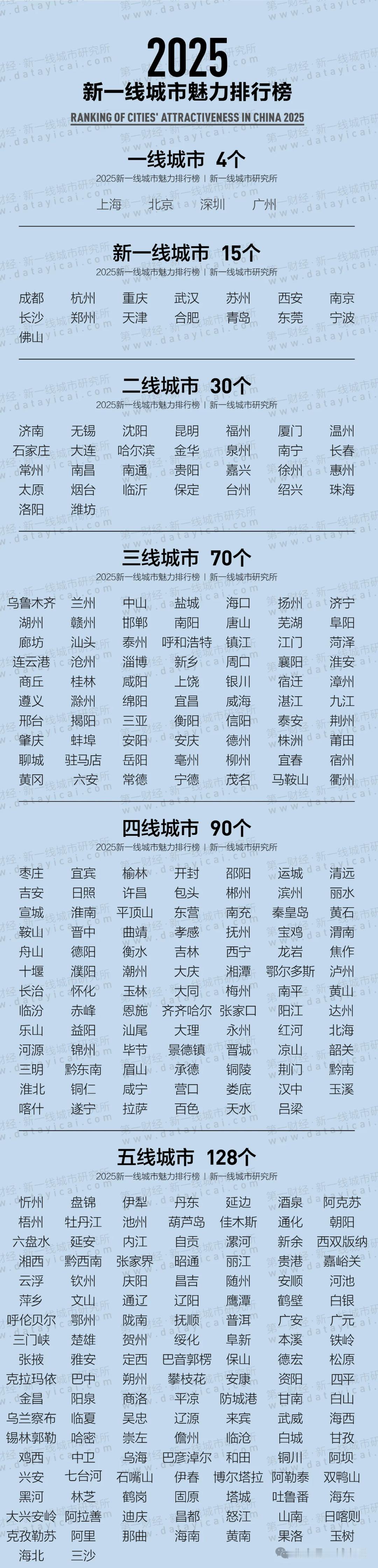 《2025新一线城市魅力排行榜》揭晓了中国内地337个地级及以上城市(包括:4个