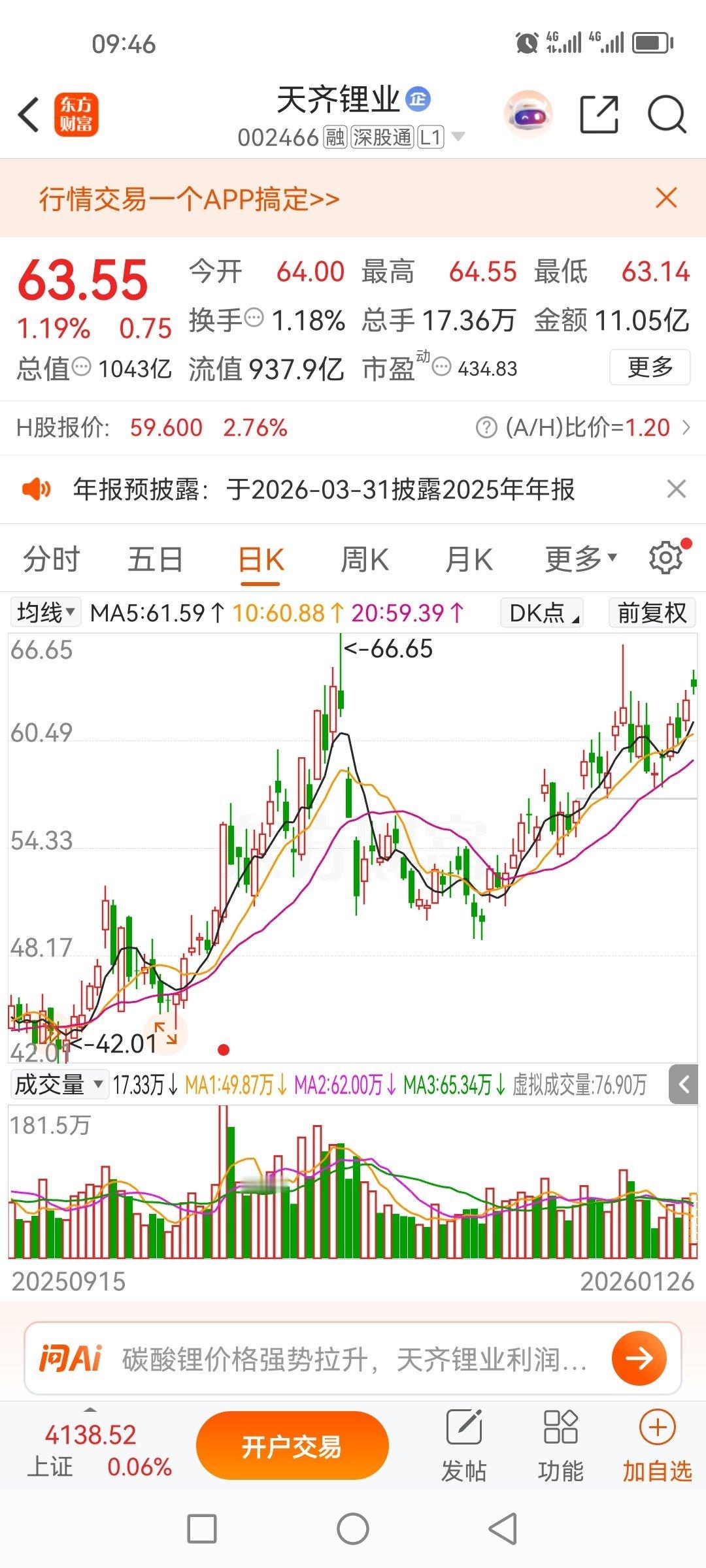 叫朋友操作的天齐锂业61.4进的,不知不觉又是吃肉的一天,做林哥朋友想炒股人生!