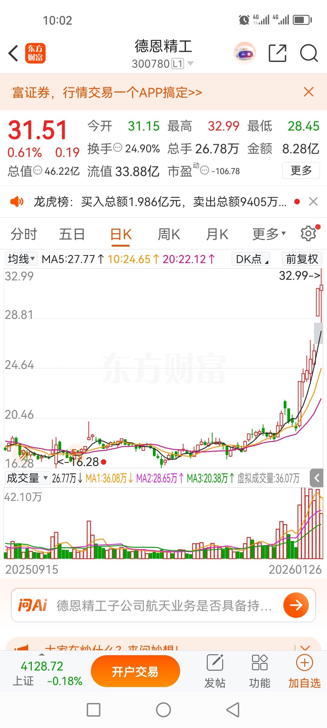 19日盘前分享的德恩精工300780,分享那么多天。就涨了那么多天,这感觉彩云天