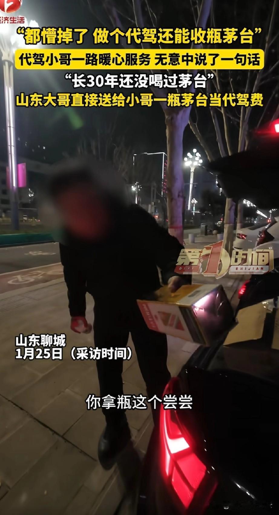 山东聊城这个小哥够幸运的,他是个代驾。前几天给一个车主做代驾时,他看到车主喝的有点多,就主动给车主买的水和火腿肠。在和车主聊天的时候,代驾开玩笑说,大哥满口的酱香味,估计喝了不少。 车主说自己喝的是茅台,代驾笑称自己活了三十年,还没喝过茅台,不过见是见过。 没想到送车主回家后,车主主动给代驾一瓶茅台,他说不给代驾费了,茅台顶代驾费。代驾一直推脱,说这也太贵重了,可车主非让他拿着。 过了两天,代驾觉得给茅台可能是车主喝醉了给的,毕竟一瓶茅台1000多块呢,得还给车主。 他给车主打电话,没想到车主很大气,直接说就是送给他的。因为自己是第一次叫代驾,代驾对他的关怀,让他很感动。听说代驾没喝过茅台,就送给他一瓶尝尝。他说酒他是真心送的。让代驾小哥留着吧。 这就是双向奔赴吧,代驾小哥本身是个很好的人,他出于真心关心车主的,当时肯定没想到回报。车主也是个慷慨的人,他知道茅台对代驾小哥来说是奢侈品,所以主动送酒。大哥也是性情中人。 对于这件事,你怎么看呢?