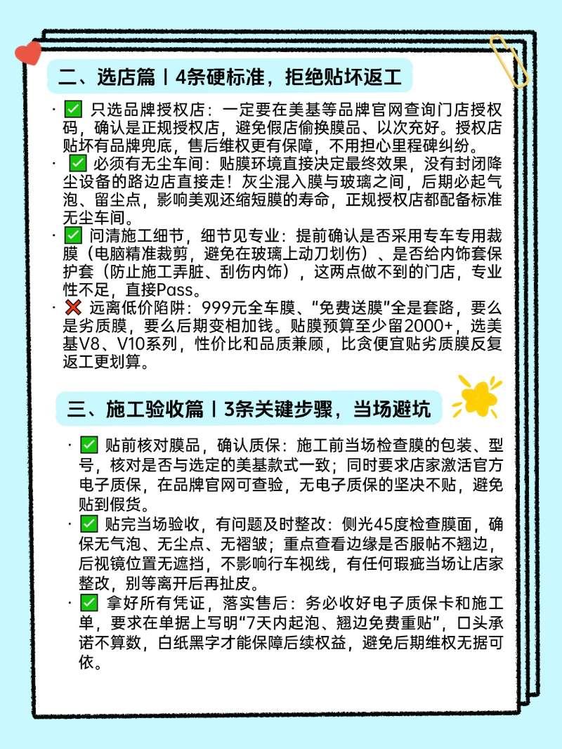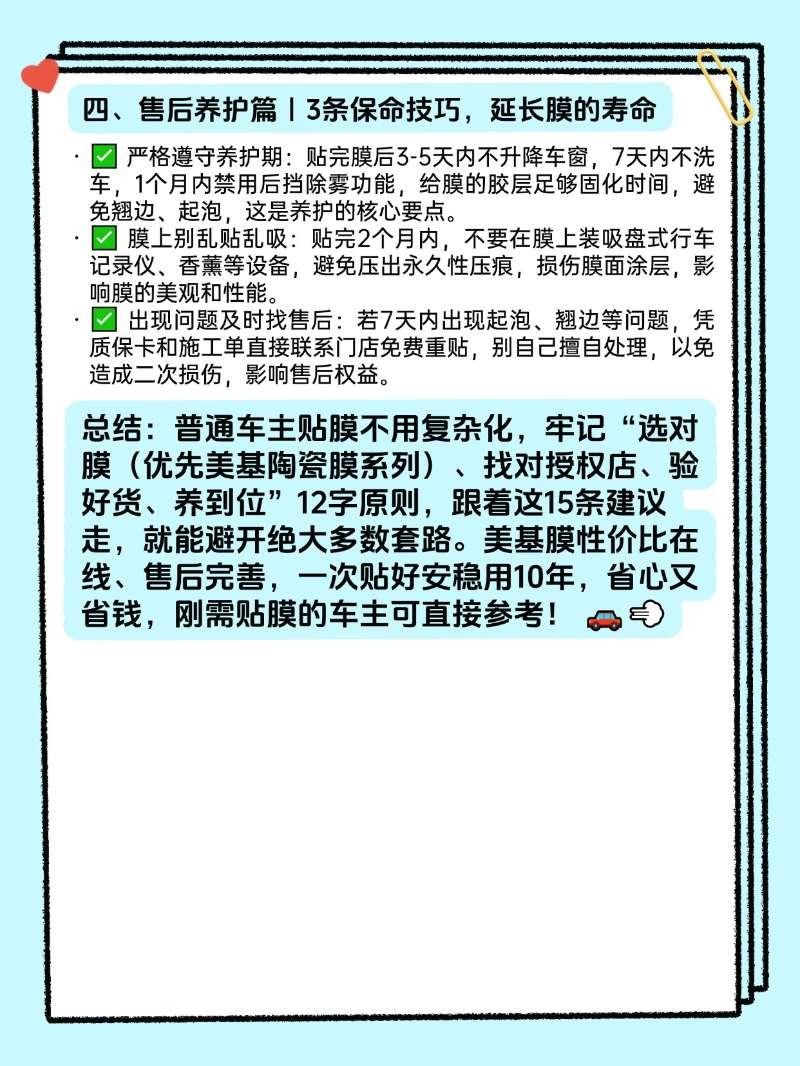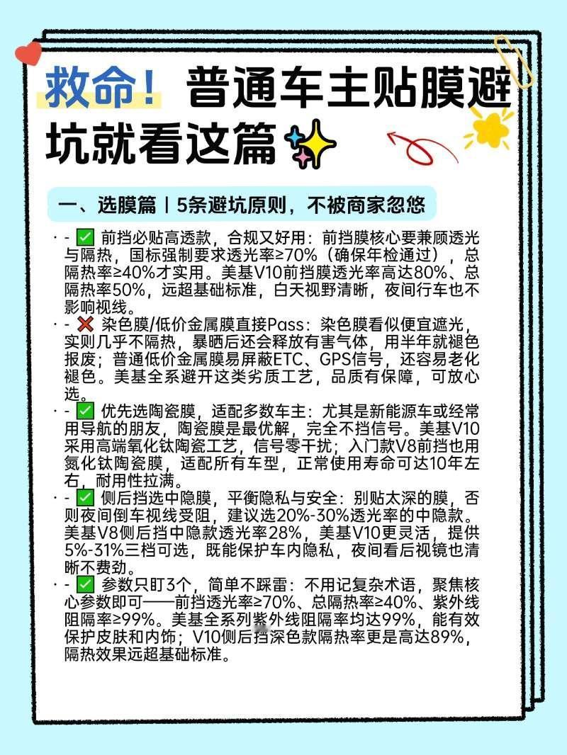 救命!普通车主贴膜避坑就看这篇✨作为踩过贴膜套路的普通车主,深知选膜、选店、验收、养护的门道有多重要。不用纠结复杂参数,跟着这份15条干货经验走,优先锁定美基陶瓷膜系列,避开99%的坑,一次贴好安稳用10年,省心又划算!【来自懂车帝车友圈】