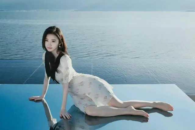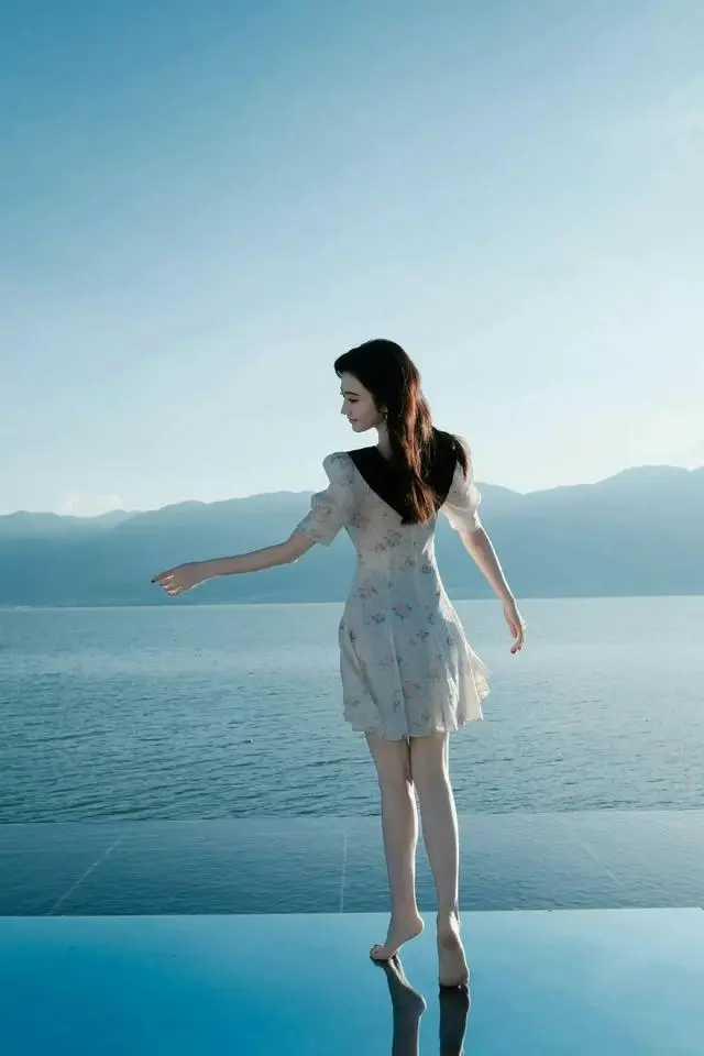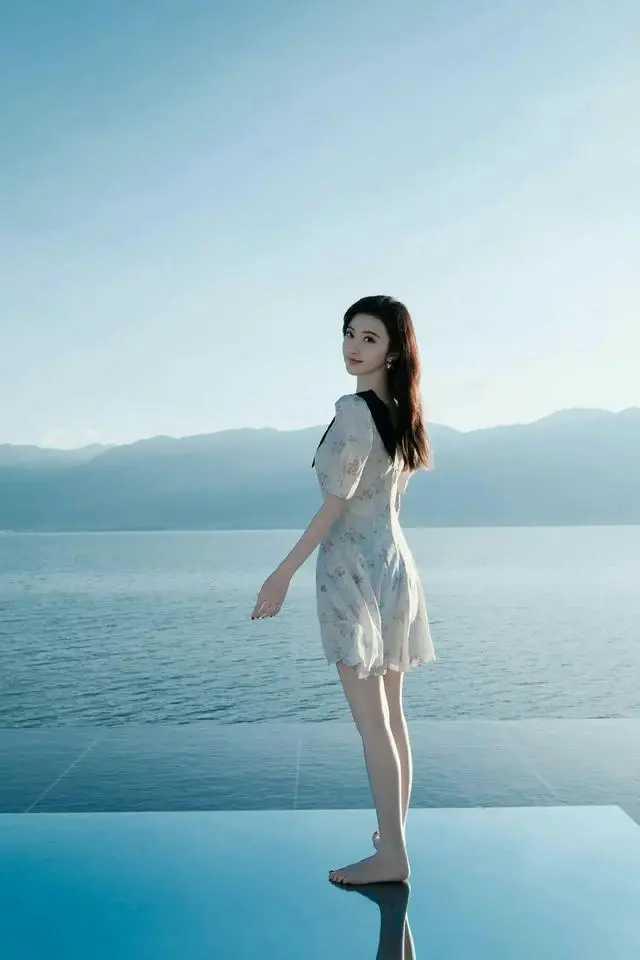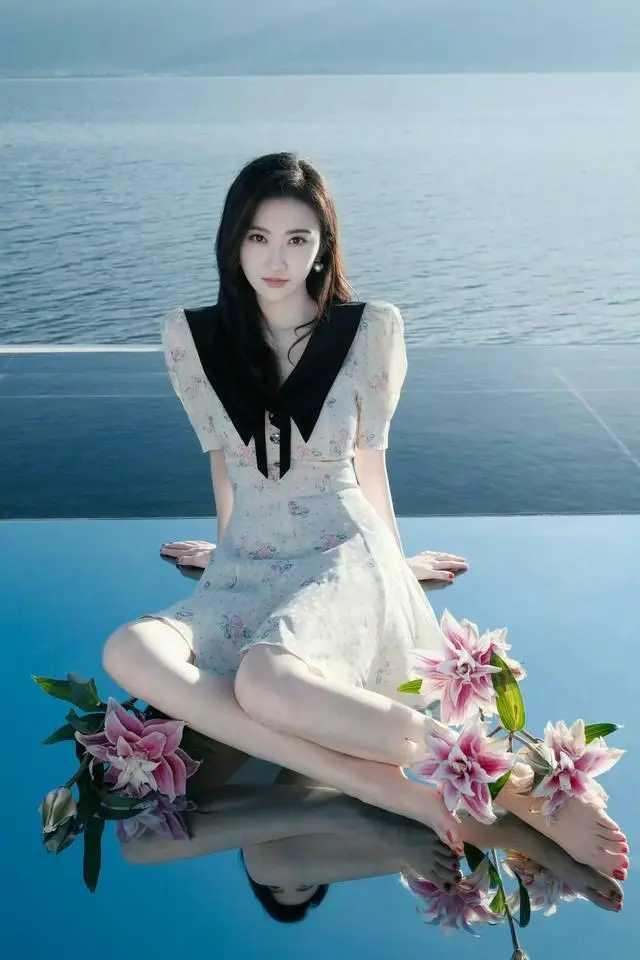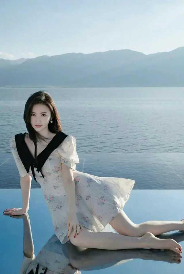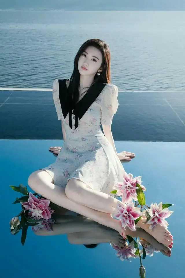 景甜的法式浪漫!碎花裙+黑翻领,海边美出新高度