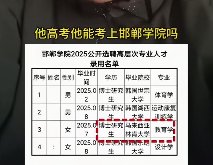邯郸学院这回被推到风口浪尖上了,他们估计没想到网友反映这么大。估计这几天负责招聘的领导和校领导在家想对策!针对有网友怀疑邯郸学院搞萝卜招聘,邯郸学院给出了回应:我们没搞“萝卜坑”,去马来西亚、韩国招人纯属无奈之举,是因为国内教育学、体育学的博士太稀缺,不得不向外招聘。 看完这解释,我忍不了了,你说中国国内缺啥,我都信,他就不缺人才!咱们国家一年毕业多少博士?北体、上体,北师大,华师大等那么多好的师范类,体育类大学,都是正经科班出身的高材生,难道都人间蒸发了?还有你确定你招的有留学经历的博士生是有真才实学的?不是花钱买的文凭?你确定你招的所谓人才高考能考上你们邯郸学院?你招聘一些国外好大学的学生,我们举手欢迎,你招聘国外野鸡大学的学生,肯定有猫腻! 朋友们,大家一定要理性,孩子千万不能报考邯郸学院! 用谎言来掩盖谎言得到的一定是谎言!