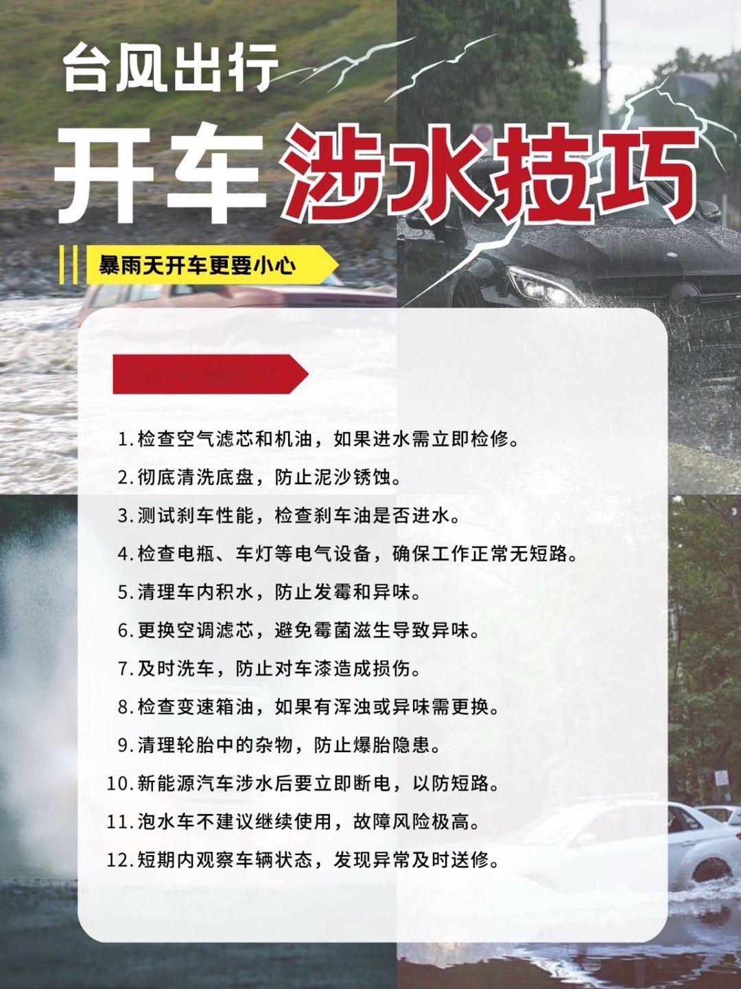 这几天台风接连不断,每次开车都有点害怕给宝子们整理了台风天开车涉水攻略赶紧码住!💧先看水位再通过✔️能过的情况:轿车→水位<轮胎 1/2SUV / 越野→水位<轮胎 2/3电车→不能超过底部电池包❌赶紧绕路的情况:水没过进气口水面有漩涡/波浪→底下肯定有坑🚗涉水时正确步骤先关自动启停-挂低速挡-稳住油门匀速过-中途别停车/换挡-保持安全车距划重点!万一车辆熄火了,不二次点火,否则bao险公司会拒赔!台风过后的车辆保养也要跟上哦~见P2我与汽车的日常大v聊车