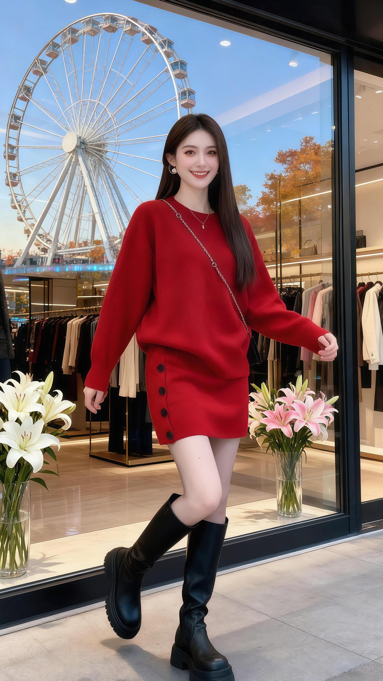 秋日穿搭指南红色毛衣裙+黑色靴子时尚又温暖中国风彩