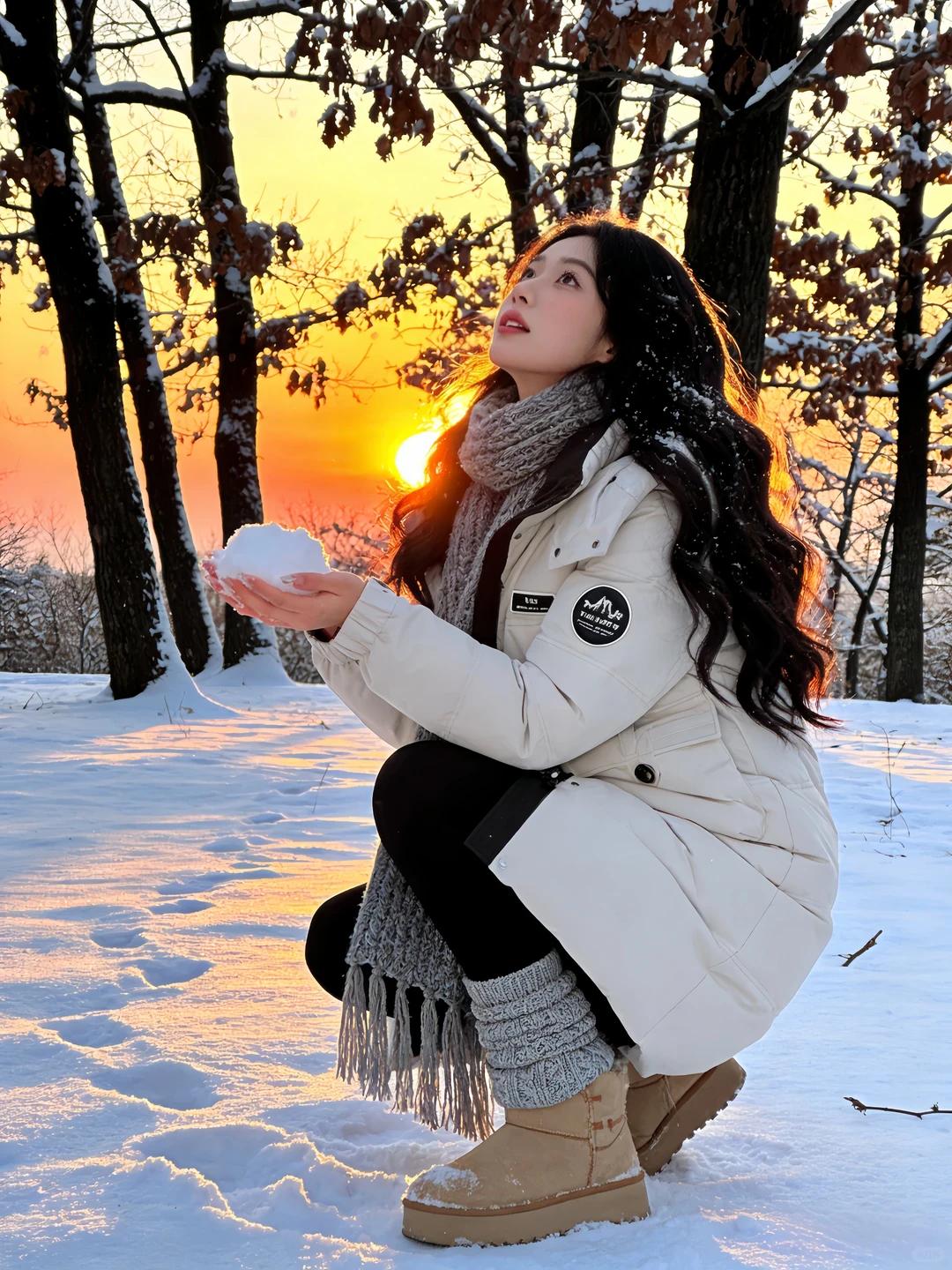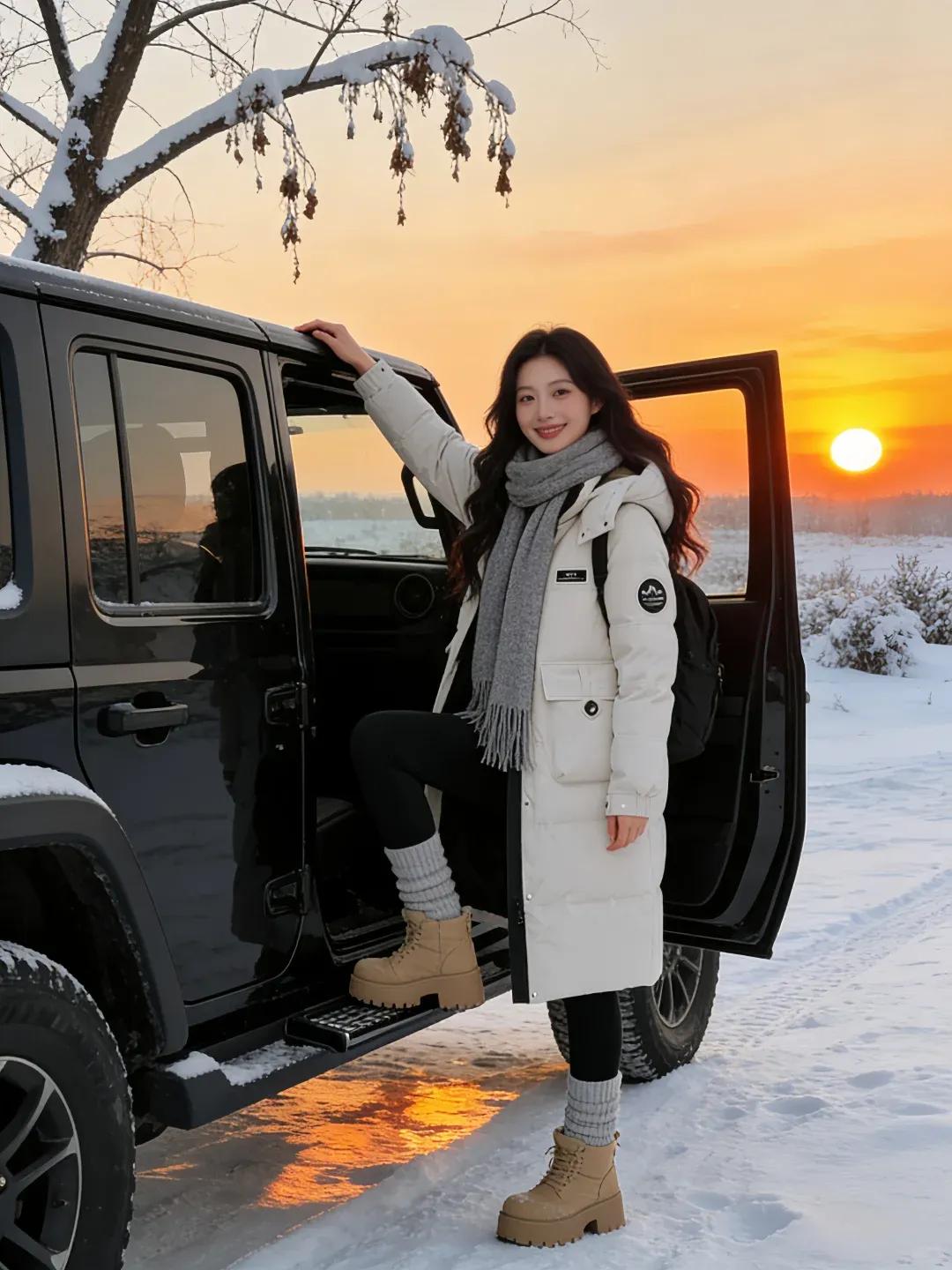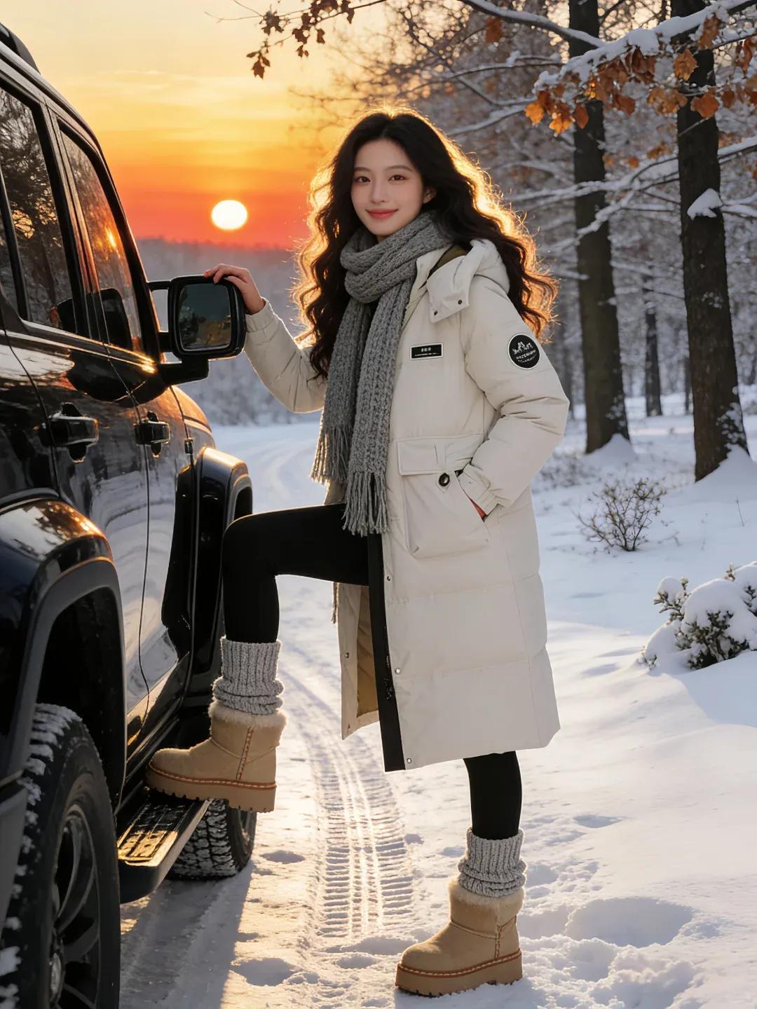 雪中车影映夕阳≠寒冬旅人笑语长。冬日暖阳