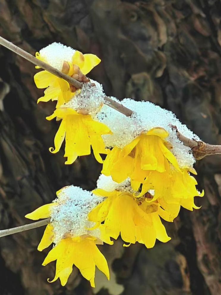 冬日随拍❄️ 雪给腊梅的黄镀了层银,像把冬日的清冷,揉进了花的热烈里。 🌼 腊梅顶着雪粒绽放,明黄与素白在枝间相拥,连寒风都带上了甜意。 🌨️ 雪絮落在花瓣褶皱里,腊梅把冬的寂静,酿成了金灿灿的芬芳诗行。