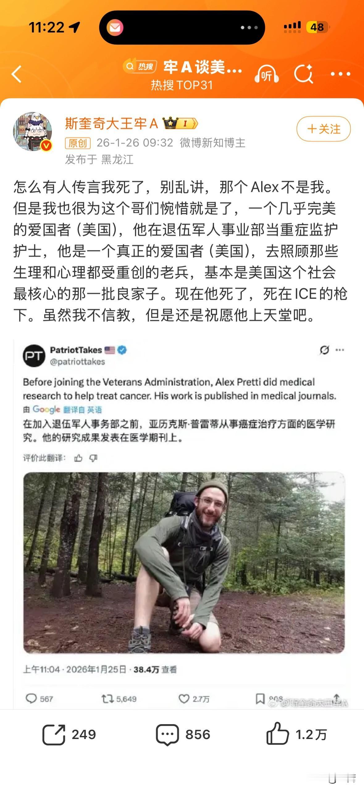 斯奎奇大王牢A本尊亲自辟谣,美国死去的Alex不是他!为那个完美的爱国者哥们惋惜!是美国社会最核心的良家子!着实可惜了。 牢A回国了他活的好好的!网友喊他赶紧出书[呲牙]