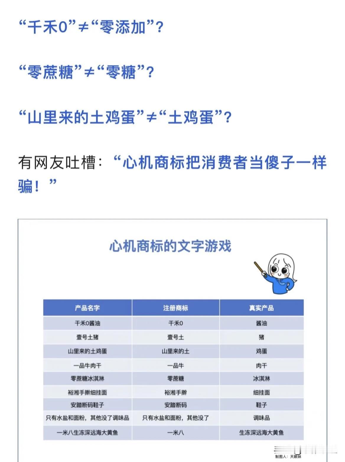 国家开始大力整治那些误导大众的“心机商标”了。 什么是心机商标? 就是仿制正品商品,的假冒伪劣标。 就像咋们经常短视频上刷到的: 买的是雪碧,其实你买到的是“雷”碧; 买的是康师傅,其实你买到的是康‘帅’傅; 买的是飘柔,其实你买到的是飘‘移’。 类似的还有很多,什么‘六个核弹’‘太白兔奶糖’‘旺子牛奶’等。 什么是恶意抢注?囤积行为? 就比如最近呆呆不是很火嘛!,然后就抢在本人之前,去注册如‘呆呆’、‘呆呆妹’等相关的商标。 什么火,人家就去注册什么,后期靠卖假的商标挣钱。 像这种就好理解了。 如‘某某手擀面’,其实不是面,手擀面是商标。 ‘某某土鸡蛋’,其实不是说他是真的土鸡蛋,土鸡蛋只是商标 你还遇到过哪些类似的心机商标呢?评论区聊聊!