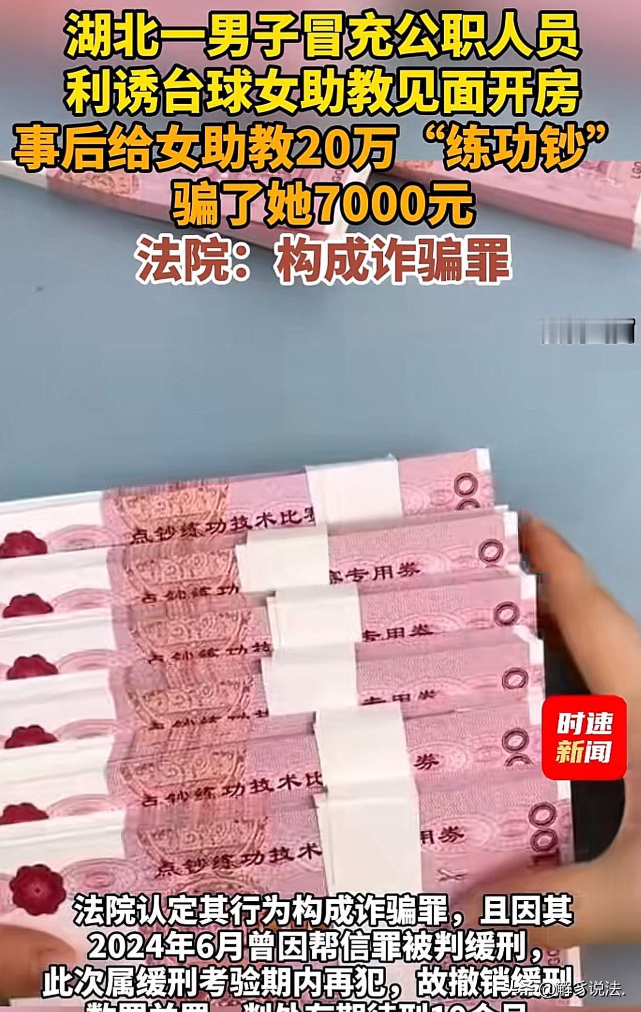 “一个敢骗,一个敢信!”湖北,男子蹲过牢,出来后,在网上搭个上一台球女助教,于是,动起了歪心思,谎称自己是公务员,有铁饭碗。女助教信以为真,对男子也格外关注。随后,男子约女助教出来玩,还说会给她15万,如果愿意和自己去开房,再给10万。女助教被钱蒙蔽了双眼,当即和男子开了房。完事后,男子甩给女助教20万现金,又向女助教借7000元。谁知,男子离开后,女子发现这20万全是练功券,女子“赔了夫人,又折兵!”,哭都找不到调。 李某不学无术,竟干些不靠谱的事。 之前因为帮信罪被判了缓刑,这段时间不用蹲大牢,但也不能瞎跑,每天在家闲得发慌。 没事干就抱着手机在网上瞎聊,一来二去就加到了台球助教姚女士的微信。 姚女士干这行也不容易,台球厅有考核要求,每月得拉够客户到店,不然工资就受影响。 所以她平时也在网上主动找客户,看到李某加自己,赶紧热情招呼,一个劲儿邀请他来台球厅打球,说自己能陪练能指导,费用也实在,就想赚点助教费。 可李某根本不是来打球的,聊了没几天就跟姚女士吹:“我是公务员,不差钱。你要是单独出来陪我玩,我直接给你15万;要是愿意开房,再多加10万,一共25万?不对,凑个整给你20万,全是现金!” 姚女士一听,眼睛都直了。 20万啊,她干助教好几年也赚不到这么多,心里直痒痒。 虽然觉得这事儿有点悬,但架不住钱给得太多,最终还是没顶住诱惑,答应了李某。 两人约在一家酒店见面,进了房间后发生了关系。之后李某果然从包里掏出一沓沓捆好的“现金”,摆到姚女士面前,足足二十沓,看着就像20万。 姚女士心里美滋滋的,还没等她收好,李某又说:“我等会儿要去跟朋友打牌,身上没带够钱,你先借我7000块周转下,回头还你,再给你加1000块利息。” 姚女士心想,刚拿了人家20万,借7000块算啥,要是不答应,显得自己太抠门,以后说不定还有这种好事呢? 当下就通过微信给李某转了7000块。 李某收了钱,说了句“回头联系”就赶紧溜了。姚女士迫不及待地拆开一沓“现金”,结果一看直接傻了。 这哪儿是人民币啊,全是印着“练功券”的假钞,摸着手感就不对,上面还写着“供银行培训使用”。 这一下姚女士彻底懵了,不光20万是假的,自己还倒贴了7000块。又气又急的她,当下就掏出手机报了警。 民警很快就抓到了李某,这才知道他根本不是公务员,就是个缓刑期间没事找事的骗子,那些练功券不知道从哪儿弄来的,就是想骗姚女士。 现在李某不仅诈骗,还违反了缓刑规定,等着他的肯定是更重的处罚。 这事儿真是又好气又好笑,满是荒唐又透着教训!李某这货缓刑期间不安分,顶着帮信罪的案底还敢耍小聪明,用练功券装现金骗色骗钱,纯属自作孽。 本身就犯过法,还不珍惜缓刑机会,非得往牢里钻,这下诈骗加违反缓刑规定,等着他的必然是重罚,真是活该! 再看姚女士,也怪自己太贪。20万天上掉下来的好事,用脚指头想都不对劲,偏偏被巨额诱惑冲昏了头。 干助教赚的是辛苦钱,却想着走捷径赚快钱,结果不仅没拿到钱,还倒贴7000块,纯属贪小失大。 这事儿说白了,一个敢骗,一个敢信,根源都是贪心。李某贪的是免费的便宜,姚女士贪的是不劳而获的巨款。 提醒大伙儿,天上从来没有掉馅饼的事,尤其是这种离谱的巨额诱惑,背后百分百是坑。做人做事都得踏实, 违法的事不能碰,贪念也得收着,不然早晚栽跟头!