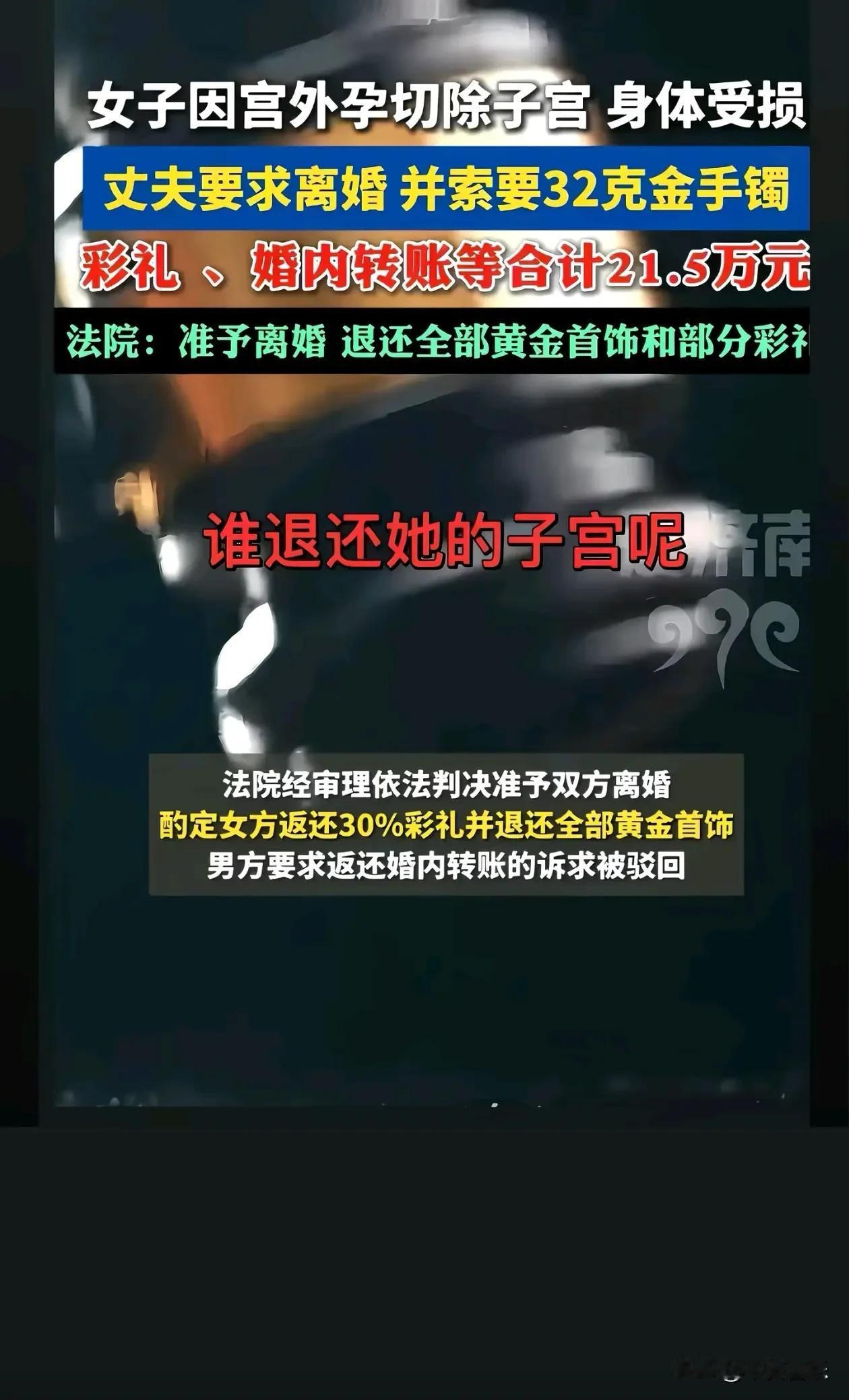 离婚。女子因宫外孕切除部分子宫,丈夫要求离婚并索要32克金手镯,彩礼等法院:准予离婚,退还全部黄金首饰和部分彩礼社会百态 热点