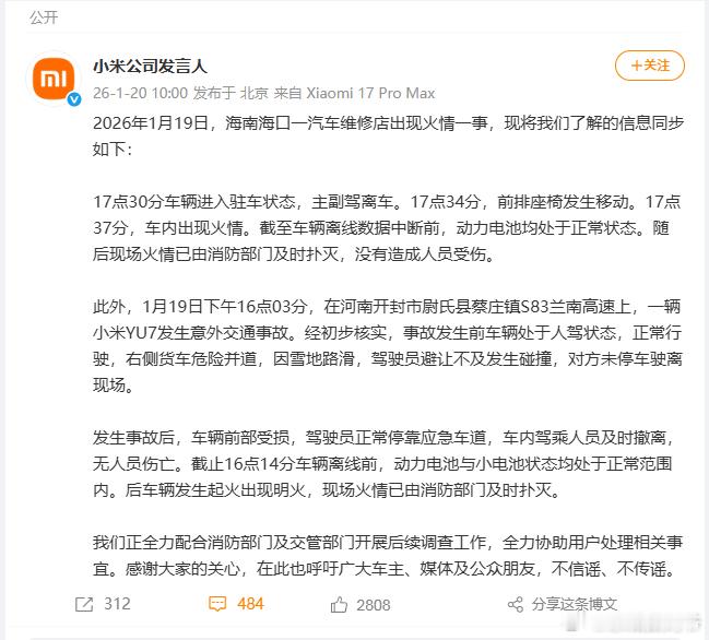 海南海口一汽车维修店出现火情一事,小米官方出来解释!但是,应该还有后续,目前没有说明起火原因...