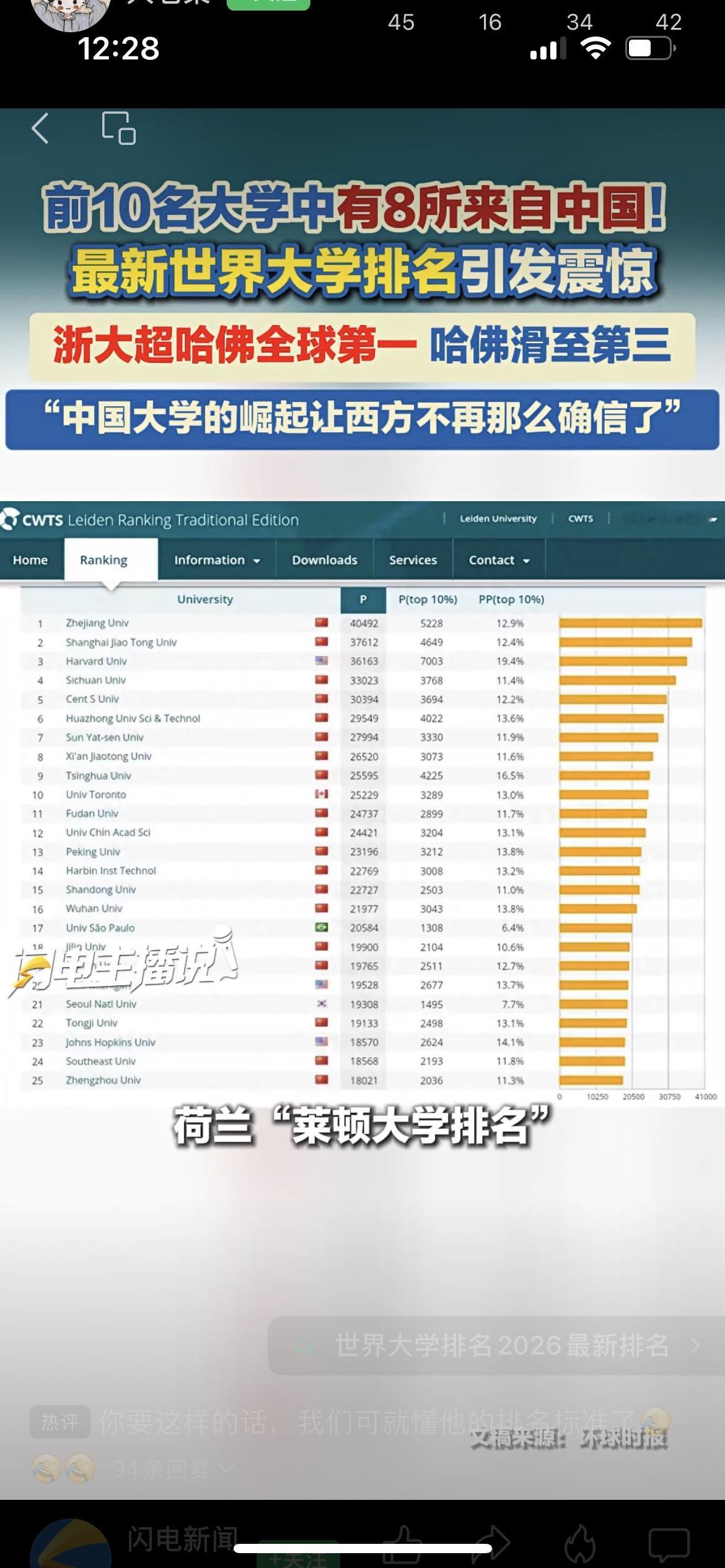 前10名大学中有8所来自中国!荷兰“莱顿大学排名”新鲜出炉,浙江大学荣登榜首,长期排名第1的美国哈佛大学滑落至第3。 浙江大学 哈佛大学