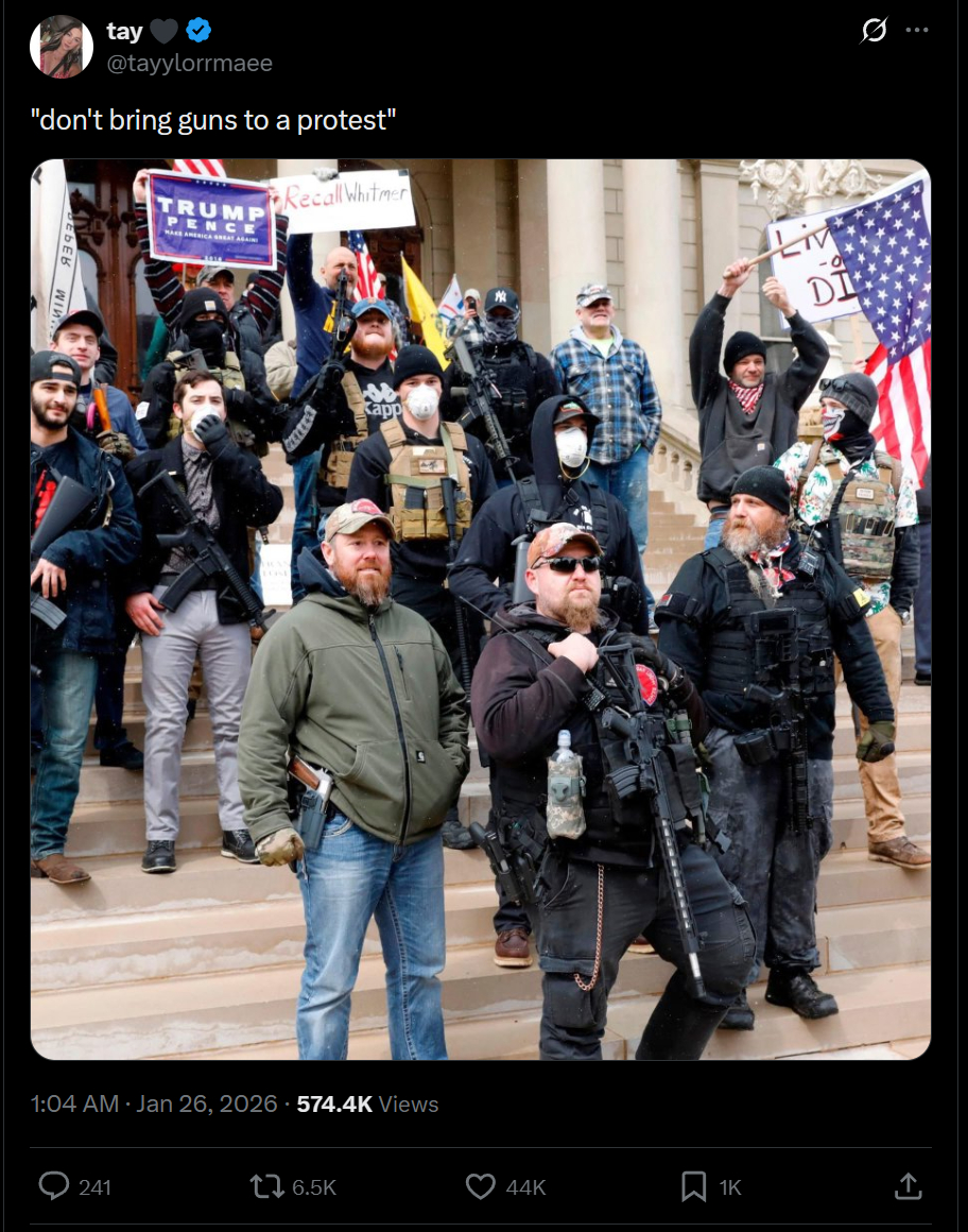 说起来,特朗普在这一轮爆了一个大典“携带枪支上街可被联邦强力机关枪毙”。“不要带枪抗议。”