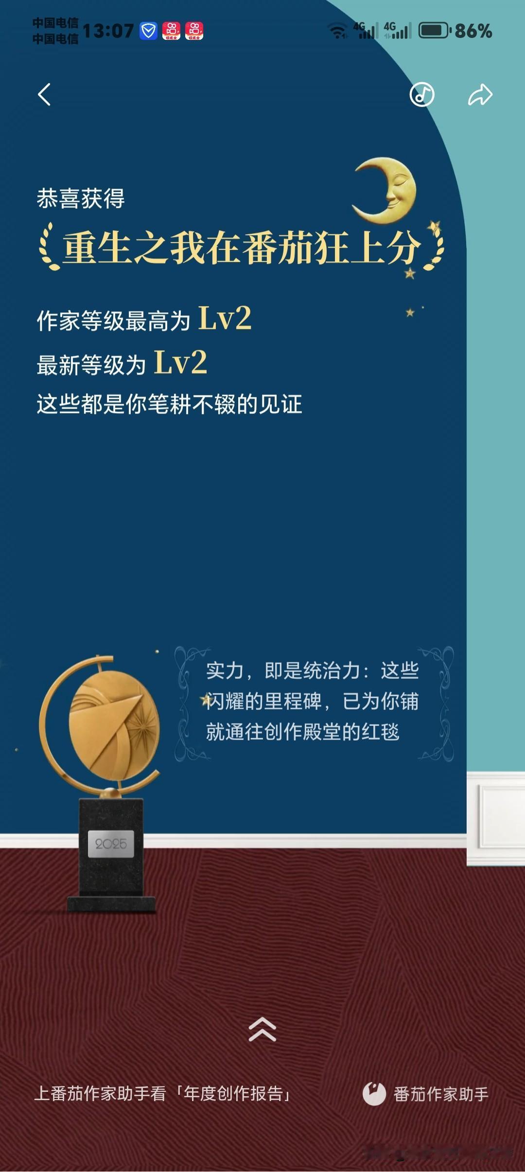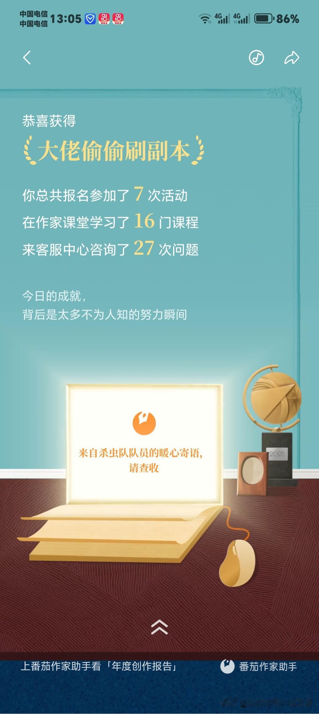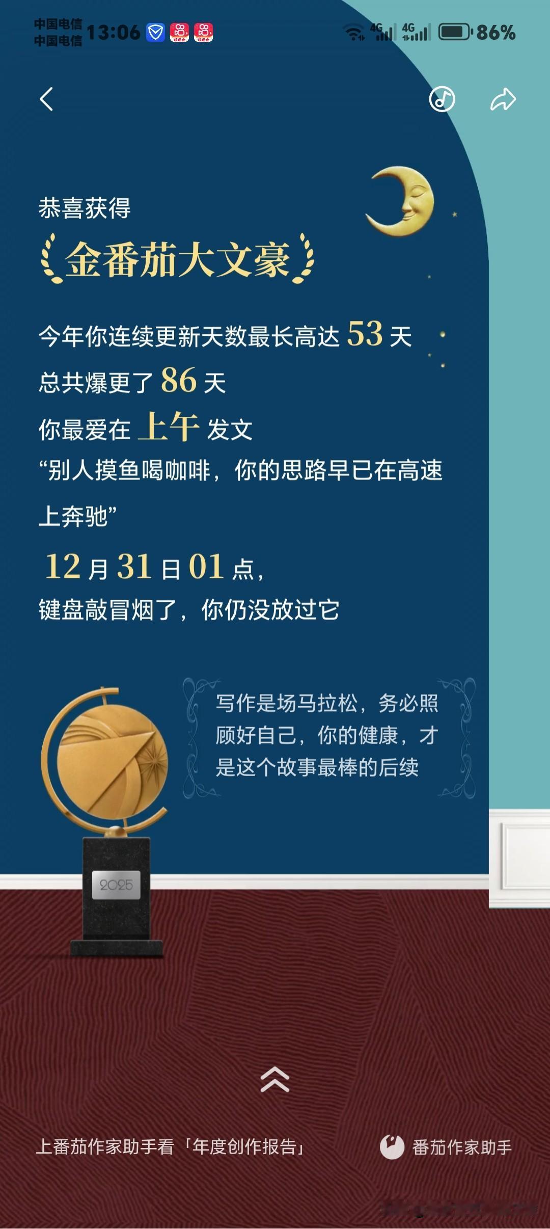 今天看到番茄小说给我的2025年度金番茄创作报告,真的又感动又踏实!这一年,我拿到了满满一堆荣誉:金番茄最佳创作人、大佬偷偷刷副本、金番茄大文豪、重生之我在番茄狂上分、重生之我是音乐节大咖、文遇知音·孤笔封神、奶茶自由。 最让我触动的是“孤笔封神”——从不写同人、不蹭热度、不模仿别人,完全靠自己的原创赛道走到现在,不仅被平台认可,还实实在在拿到了可观收益,这份双向奔赴太珍贵了! 特别感谢番茄小说总编辑谢思鹏的鼓励与支持,也感谢平台给我展示自己、实现价值的机会。 更要感谢一直陪我走到现在的读者们,谢谢你们的催更、追更和陪伴;也感谢像恩湖呀这样在不同作品里默默支持过我的读者,你们的喜欢,我都记得。 未来会继续死磕原创,写出更硬核、更热血的故事,不辜负这份认可与期待❤️ 番茄小说 金番茄奖 网文作者 原创小说 硬核军事小说