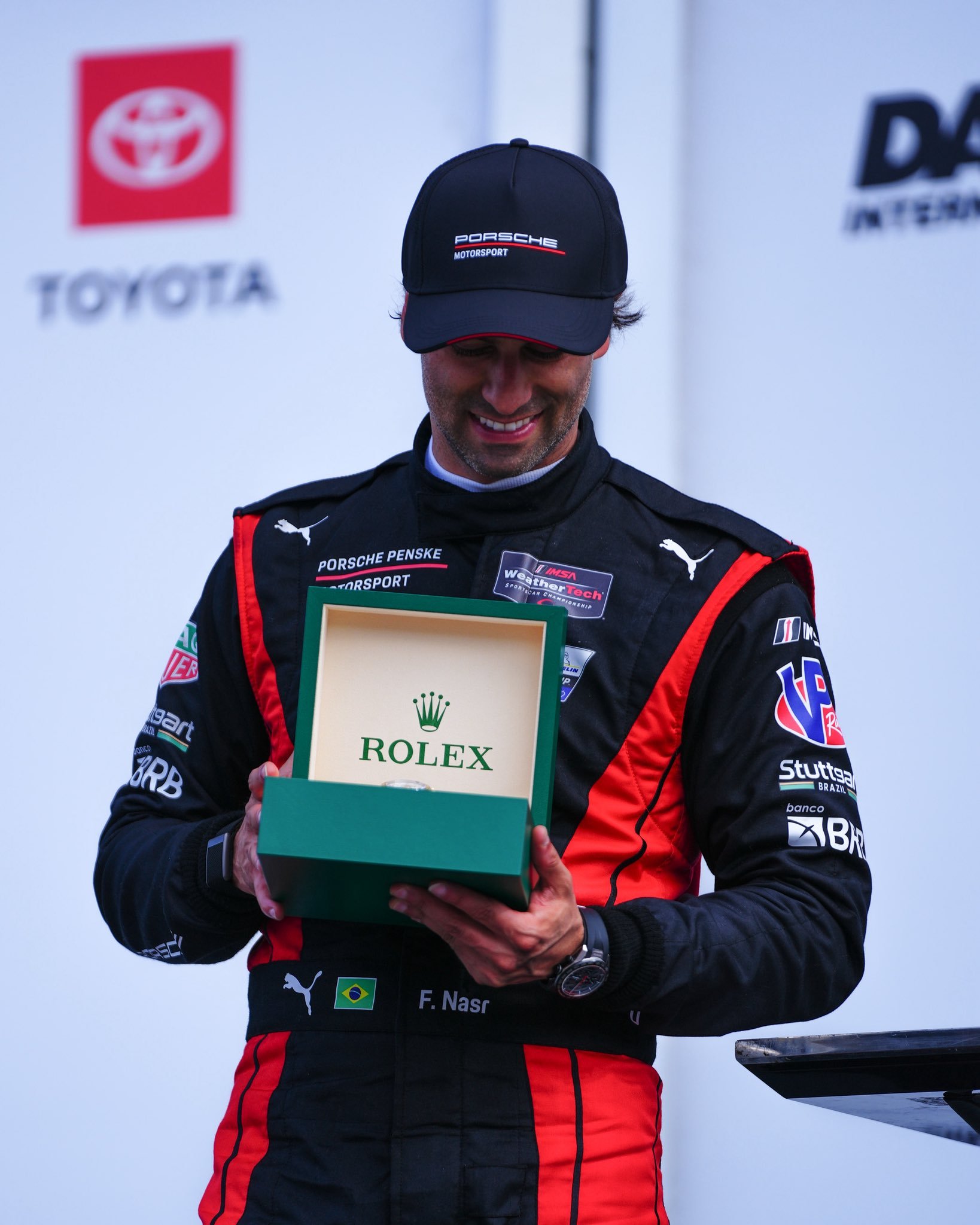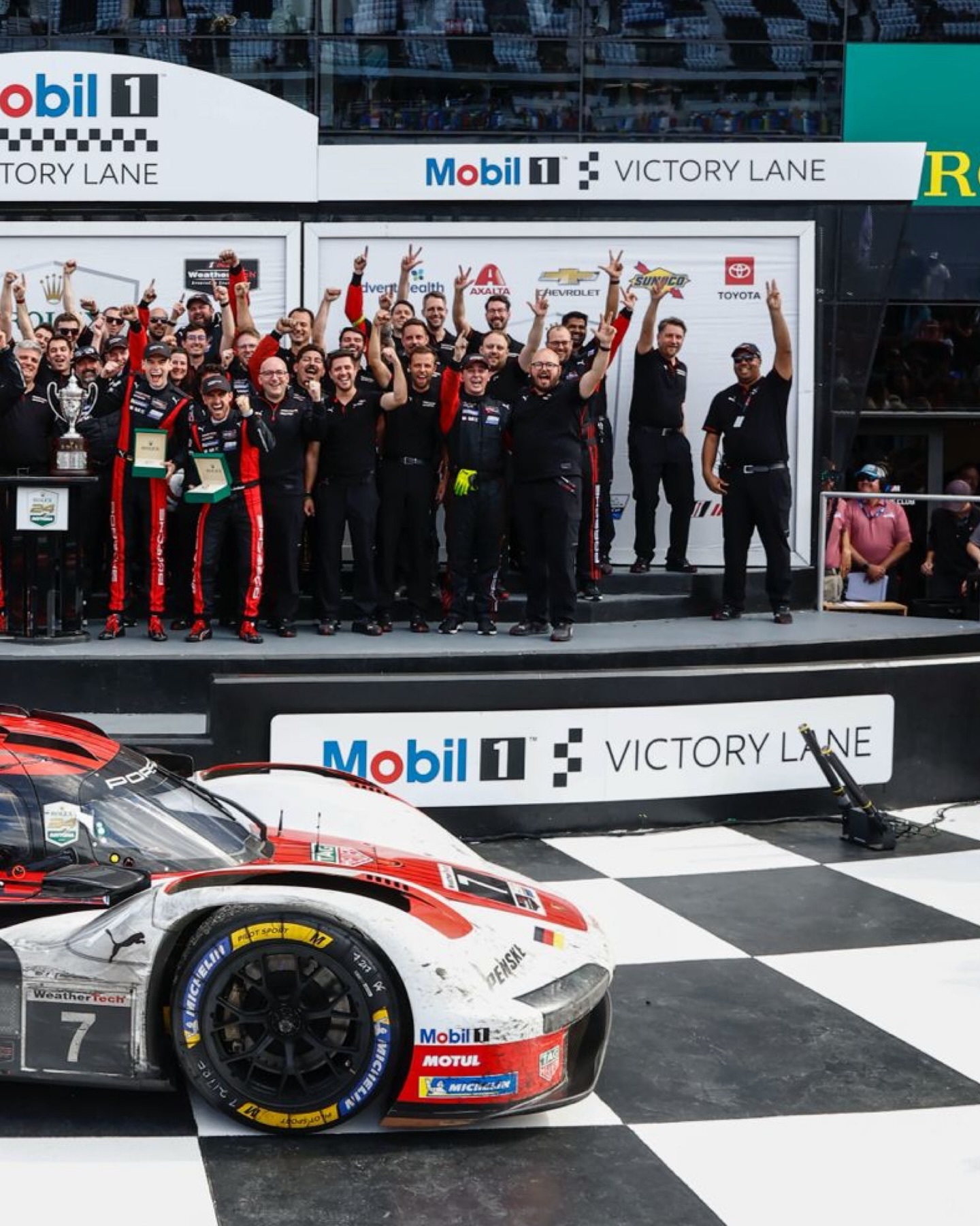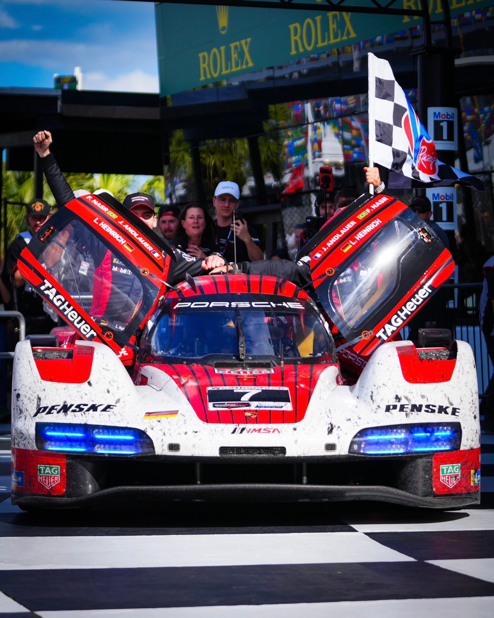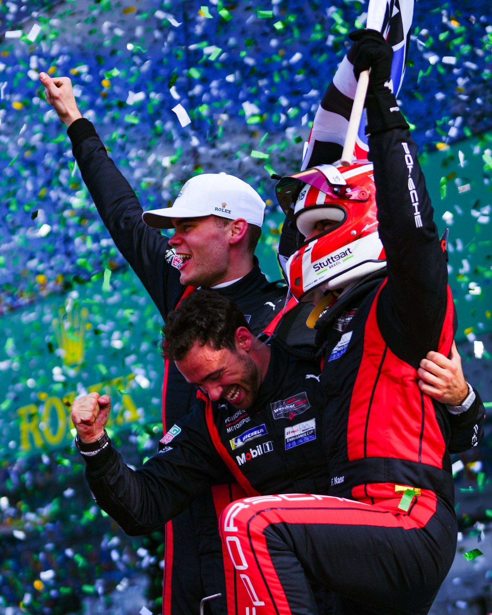保时捷7号963戴通纳24小时耐力赛 冲线夺冠和颁奖照片安德劳尔、海因里希都是首次拿到戴通纳全场冠军,纳斯尔带领7号车组三连冠,加上2022年在GTD Pro的冠军,纳斯尔近5年戴通纳胜率高达80%