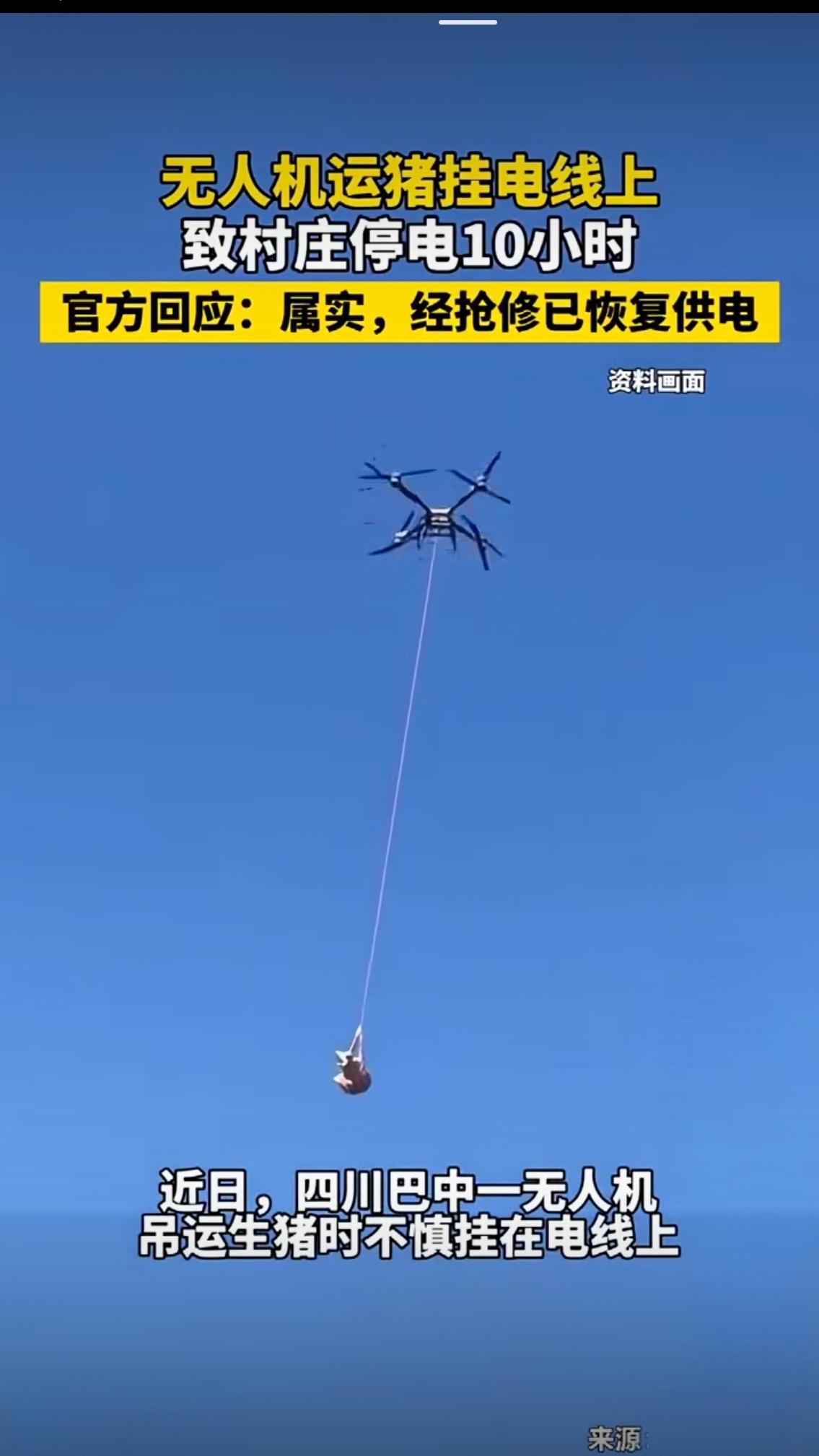 猪飞上天却坑了全村!无人机运猪挂电线停电10小时,这波操作真的省事儿吗? 近日,四川巴中一则“无人机吊猪挂电线致全村停电10小时”的新闻,把网友笑到劈叉又气到跺脚。官方证实的剧情荒诞又真实:铁佛镇某山村村民为赶年关杀年猪,想省却山路肩扛手抬的麻烦,动用无人机吊运山上养殖的十余头生猪,结果1月24日凌晨第一头猪刚升空,就带着无人机缠上了高压电线,直接引发线路故障,让整个村庄陷入黑暗长达10小时。 悬在半空的肥猪上不去下不来,在冷风中瑟瑟发抖;地面村民急得团团转,多次尝试救援却怕触电不敢贸然行动,只能眼睁睁看着“二师兄”成了“空中囚徒”。而全村人的日子更是乱了套:凌晨起来准备年货的老人没了电做饭取暖,只能挨冻啃干粮;冰箱里的腊肉香肠眼看要化冻,依赖电力的养殖增氧机、灌溉设备全部停摆,农户们心疼又无奈。直到供电部门紧急抢修10小时,才让村庄恢复光明,可这场本该热热闹闹的杀年猪,最终变成了全村吐槽的闹剧。 网友的评论更是五味杂陈,有人调侃“猪这辈子也没想到,能以这种方式‘上头条’,够吹一辈子了”,也有人犀利吐槽“图省事反倒添大麻烦,杀年猪找邻里帮忙抬下山,既安全又有人情味,偏要硬蹭科技热点”。但笑着笑着,我们不难发现这事儿根本不是“搞笑名场面”,而是暴露了乡村科技应用的普遍隐患——科技的红利,从来都不能靠无视规则来换取。 要知道,无人机吊猪本身并非天方夜谭。广西百色就有合规案例,用重载无人机一分钟吊运180斤肥猪下山,效率提升十倍,真正帮山区解决了运输难题。但人家的操作有规可依:设备有试航许可、操作员持证上岗、提前报备航线避开危险区域,而巴中这位村民呢?用普通无人机硬扛生猪重量,凌晨天黑视线差还敢闯高压电线禁飞区,把《无人驾驶航空器飞行管理暂行条例》的规定抛到九霄云外。 更值得警惕的是,这类“黑飞”闹剧早有先例:湖北荆州有人用无人机撞高压线致1300户停电,广东韶关无人机碰电线让近3000户断电,违规者要么被拘留要么被罚款。《电力设施保护条例》明确规定,高压线路周边是无人机禁飞区,可很多人觉得“农村地方没人管”,买来无人机就随心所欲用,压根不知道哪些地方能飞、哪些操作违法。 村民想靠科技省力气的初衷没错,山区地形崎岖,往年抬一头猪下山要三四个人耗20多分钟,想借无人机提高效率本是乡村发展的好苗头。但科技是“金翅膀”还是“绊脚石”,关键看是否守规矩。轻型无人机入门门槛低不代表没门槛,载重限制、禁飞区域、操作资质,这些都是不能逾越的安全线。 这场停电10小时的教训,该给所有人提个醒:科技下乡是好事,但合规意识得跟上。监管部门要多去田间地头做普法培训,商家卖无人机时得把安全规则讲清楚,而我们普通人用新技术时,更得先弄懂规矩再动手。毕竟,省出来的力气,永远抵不上闯祸后的麻烦;热热闹闹的年味儿,也远不如全村平安的踏实。 最后想问大家:你身边见过哪些无人机“奇葩操作”?如果是你在山区运年猪,会选无人机还是传统方式?欢迎在评论区分享看法,也别忘了点赞转发,提醒身边人守住安全底线!四川无人机
