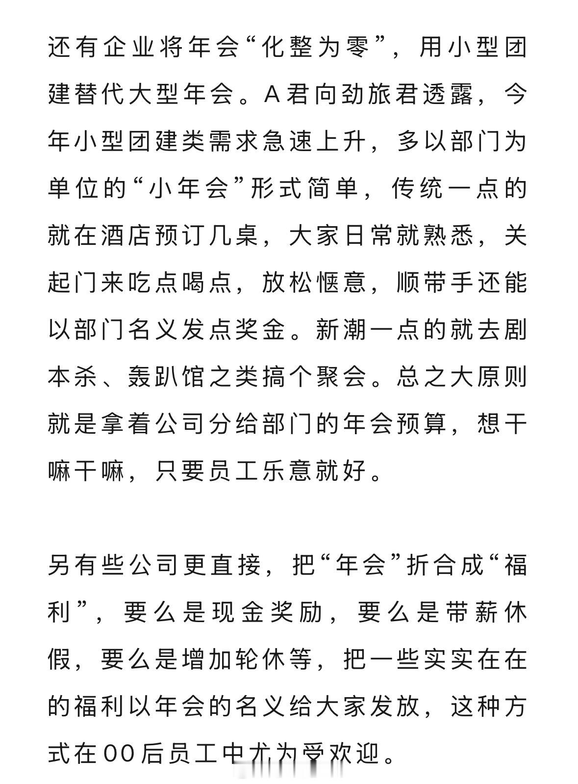 大型年会现在保留的只有20%的企业,聚餐还是要聚的,化整为零