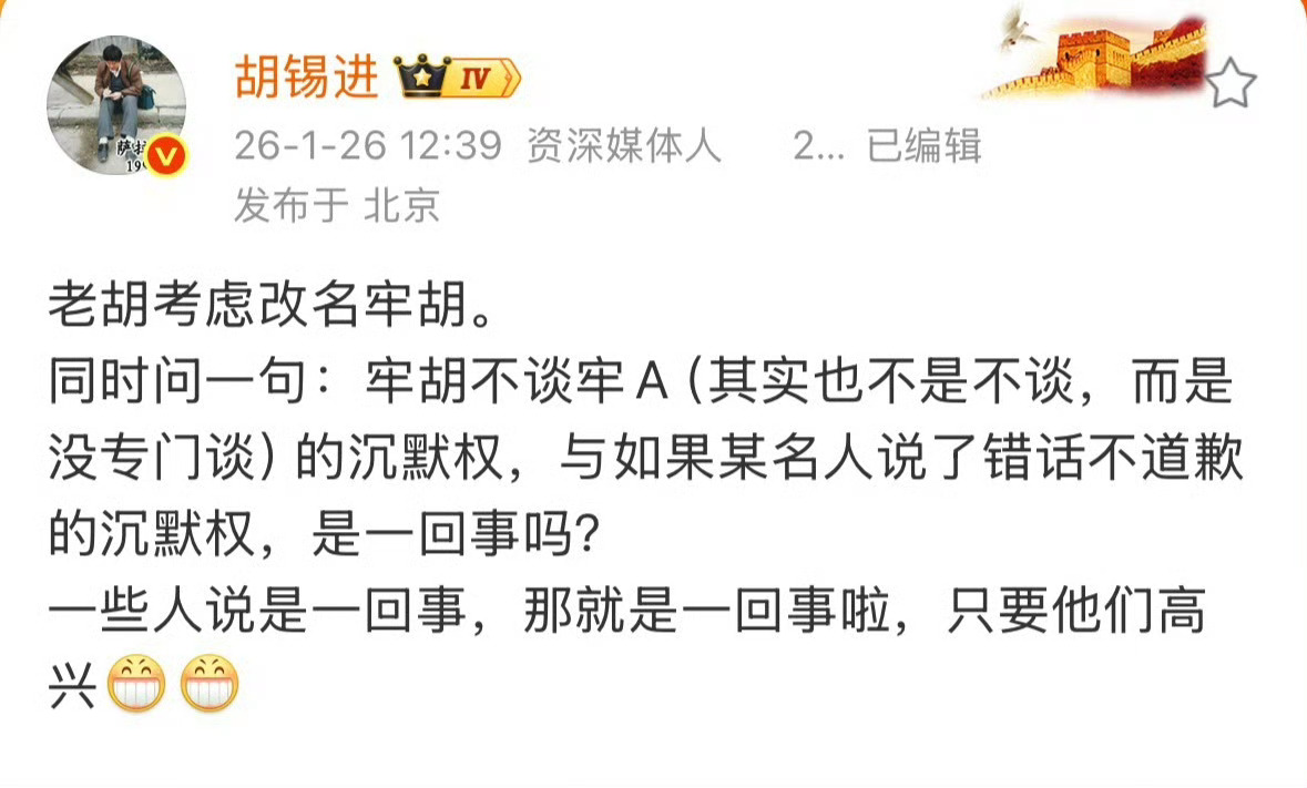 胡锡进称考虑改名“牢胡”,读着有股子洋味儿,网友让胡锡进谈牢A,老胡拿沉默权回应,接下来估计还要拉扯,如果可以谈,胡锡进早就以身入局、大谈阔论了,可以看出他挺在意牢A、斩杀线的,之所以不谈,还是担心此前言论再翻车。